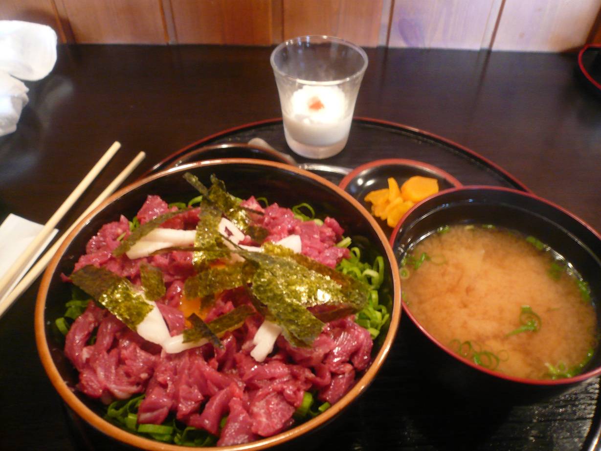 福山市神辺町字下御領809-1 084-965-0808 今日は福山仕事2日目。 今日は少し余裕がある。 しかしこの神辺町は魅力的な街だなぁ。 旨そうな雰囲気のお店がたくさんある。 どこにしようか真剣に悩んだ。 楽しい悩み。 でも一番仕事場から近いこちらのお店をチョイス。 馬肉の専門店と聞いていた。 しかし看板は「鍋奉行」と書いてある。 これは業態変したかな? なんて思ったけどメニューを見てほっとする。 ランチは牛肉と馬肉のメニューとなっていた。 せっかくだし今回は馬肉で勝負だ! ネギ桜丼700円。 馬肉はかなりたたいた感じで細かく刻まれた肉だなぁ。 そして少し鬣も乗っている。 ネギもたっぷり。 醤油を少しかけてがぶついてみると脂が少しある肉でもねちょっとした脂の食感は無い。 脂が甘くて旨いなぁ。 馬刺しは赤身の旨さだけど、700円なんだからいい赤身だけなんてなかなかね。 でも充分旨い。 鬣の甘さは強烈。 旨さが強くて楽しくなるね。 でもくどくないし旨い。 途中で乗ってある卵黄をかき混ぜて食べても旨い。 これはいいなぁ。 味噌汁も付いてる一口分くらいのヨーグルトもある。 とても美味しかった。 次は夜に行ってみたいなぁ。 ご馳走様でした!!