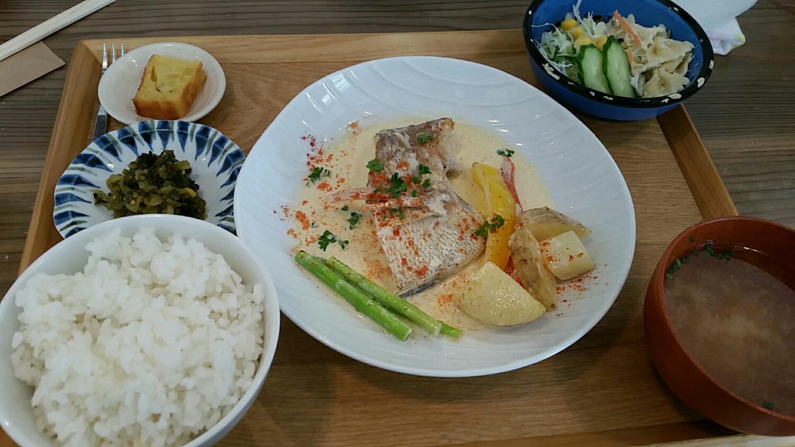 福岡市西区姪の浜6-6-2 092-834-3400 今日はランニング中に見つけたお店。 こんなところにあったっけ? なんて思いながらふと気づいたお店。 喫茶店のような雰囲気のお店で子供連れのお客さんが多いな。 子供の絵本も多いし、うちの子たちも連れていけたら喜ぶかな? なんて思いながら着席。 漬物が自由に取れるのでそれを食べながら待っていたのですが。 こんなものが出てきました。 日替わり定食800円。 この日は鯛のクリーム煮がメインの定食。 そこにサラダ、ご飯味噌汁、小さなケーキがついてくる。 クリームにはとても優しい味わいでお店の雰囲気でぴったしだなぁ。 鯛は骨も多いけど、旨みもしっかりしているし。 ご飯も美味しかったし、味噌汁も美味かった。 雰囲気も味わいも丸い優しいお店でした。 夜はイベントも多いみたいなので夜も行ってみたいな。 ご馳走様でした!