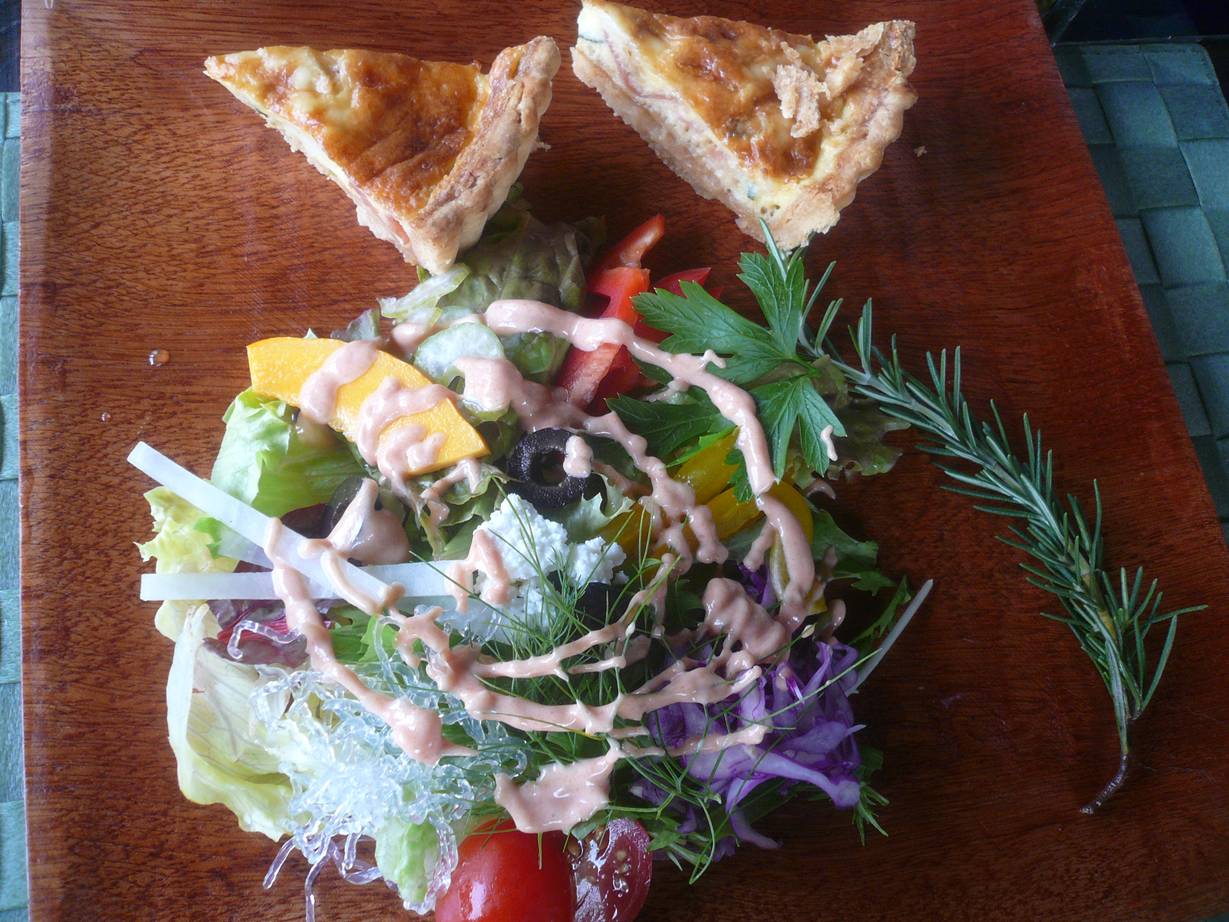 広島市安佐北区大林町代田2442-1 今日はドライブがてらにやってきた喫茶店へ。 山の方にひっそりとある感じ。 近くには「ガラスの里」があると言えば分りやすいでしょうか? 周りにはカエルの鳴き声が響き、花がたくさん咲いている。 どうやら工房もされているようで木製のおもちゃがたくさん並んでいた。 優しいランチが食べれるらしいのでおすすめのランチを2種類いただきました。 僕はこちら キッシュランチ950円。 キッシュとサラダかな? 後はドリンクが付く。 キッシュはハムやチーズや野菜がたっぷり入った感じ。 ハムもチーズも香りが良く、上質なものを使ってくれているのかも。 食べると爽やかさを感じるなかなかの味。 サラダはハーブがたくさん使われていた。 好みでオリーブオイルやハーブソルトを使えるのだけど、ドレッシングがかかっているので必要ないかもね。 サンドイッチランチ1,250円。 サンドイッチとキッシュと別皿でサラダがたっぷり付く。 サンドイッチもチーズ・ハム・レタス系のサラダがたっぷり。 しっとりとして食感には好みが分かれそうだけど、パン自身が美味いから良いね。 麦の香りがするパンで食べれるとどんなものでも幸せを感じれるね。 ソースも酸味が軽く感じられる表立たない感じで優しい。 場所にもピッタシの料理だね。 最後はアセロラのハーブジュース。 口の中が綺麗に流されていくね。 全てが整っていて一つのコースとなっていた。 料理・景色・時間。 こういった落ち着いたランチもいいね。 また行きたいな。 ご馳走様でした!