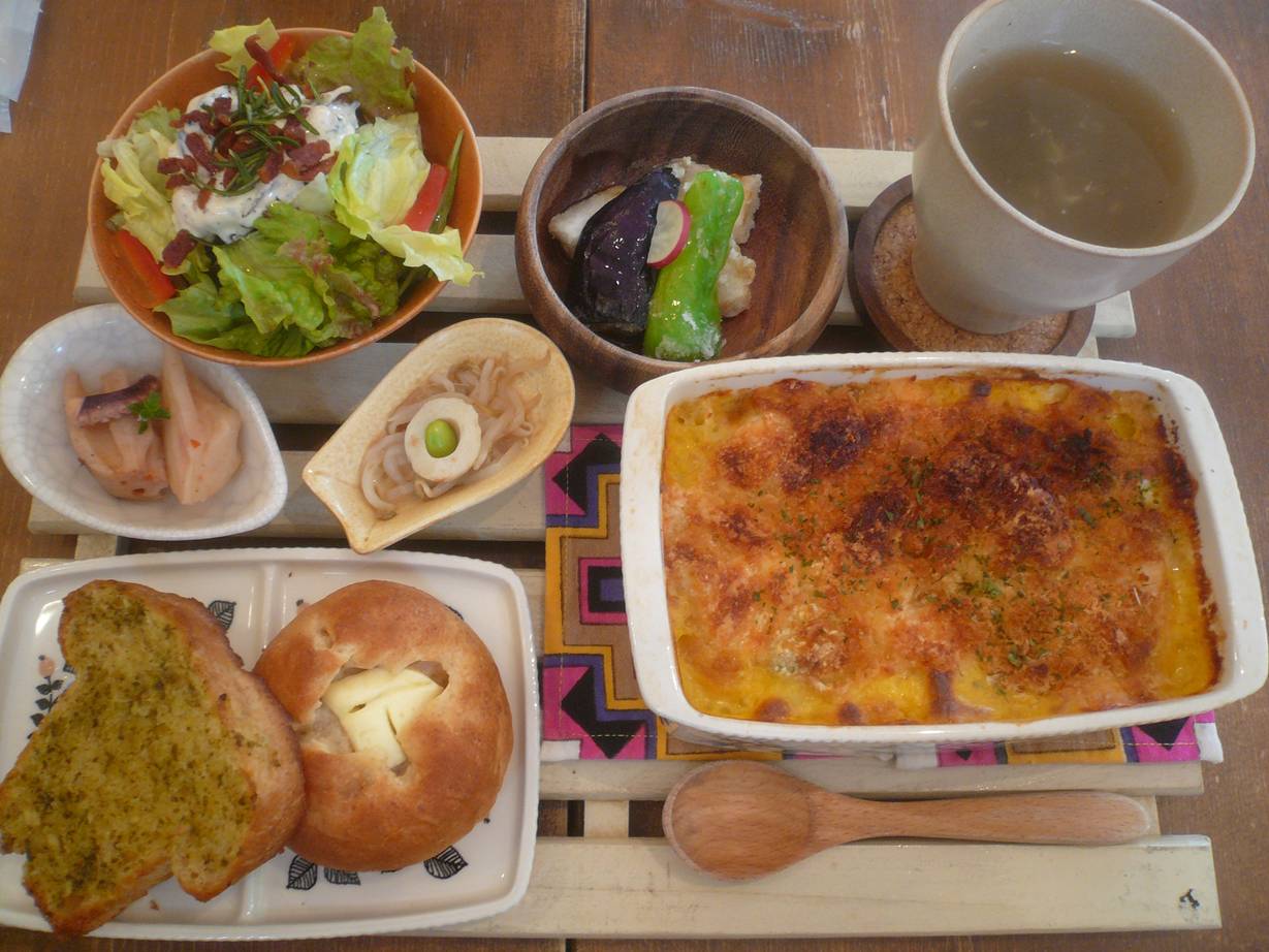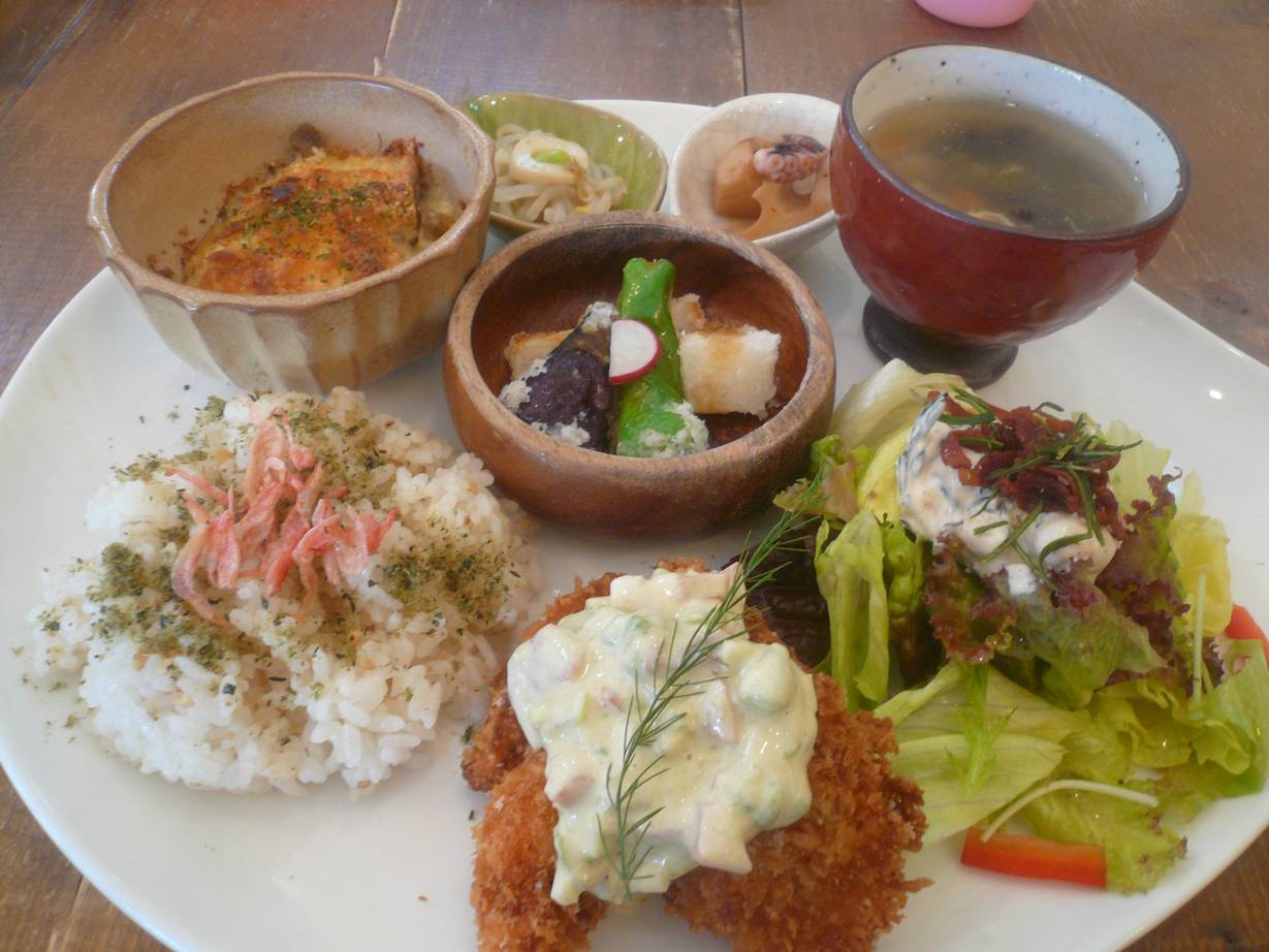 広島市安佐北区可部町勝木1841-2 今日は安佐北区可部の住宅街にあるお店へ。 住宅街の中にあるログハウスのようなお店。 行ってみるとお客さんはたくさんおられた。 店の造りも落ち着く感じだし、なんだかいいな。 名前通りの喫茶店だけどみんなランチを頼んでいる。 僕らもお腹が空いているので素直にランチを。 月変定食1,280円。 メインはホタテと鶏のフライ。 それに野菜の天麩羅・もやしとちくわの梅肉和え・蓮根の炒めもの・カボチャグラタン・野菜サラダ・野菜たっぷりのスープにご飯。 フライはタルタルソースがたっぷり乗っていた。 かじってみると、ホタテの香りと鶏の食感が面白い。 鶏はしっとりとして脂身が少ない感じの肉かな? そこにかかっているタルタルソースがトマトやアボカドがたっぷり入っていて旨味があって爽やかもあるので食べやすい。 もやしは梅肉が効いてて酸味が美味いし、蓮根もイカゲソかと思ったらタコが入っているのが美味しい。 カボチャグラタンは濃厚でしっかりチーズも効いてて美味い。 野菜もたっぷりだ。 どれも熱い料理は熱々だし、サラダとかはしっかり冷やされている。 丁寧さも感じて嬉しいね。 グラタン定食1,280円。 メインがグラタン。 カボチャグラタンだったけど、僕のと違ってマカロニやキノコがたっぷり入っている。 これも美味いね。 チーズケーキとオレンジジュース。 チーズケーキはわりと普通かな? 甘みが少なく濃厚なのは最近多いよね。 キャラメルロールケーきとリンゴジュース。 キャラメル感は強くないけどちょっとカラメルぽい苦味があとで追いかけてきて食べやすい。 美味しいケーキですね。 なかなか満足感が高いランチでした。 値段的には少しビビったけど、充分でした。 またゆっくり食べたいな。 ご馳走様でした!