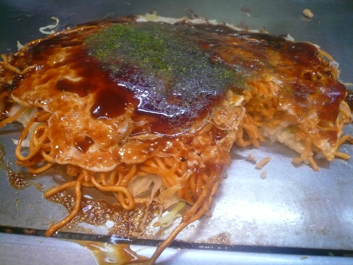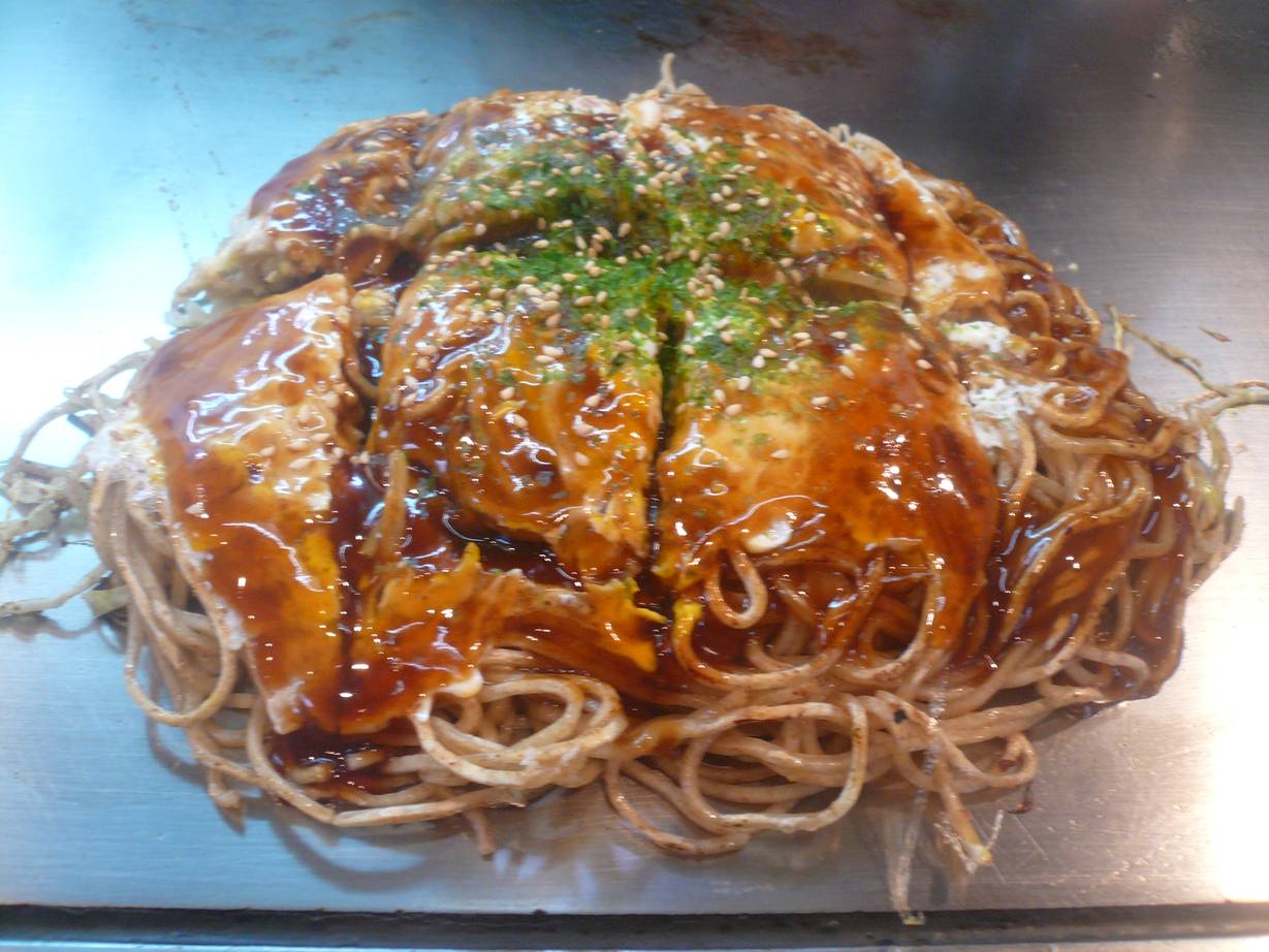 府中市府中町898-1 0847-41-4401 今日もまた府中市に来た。 今月2回目。 と言うことでまた府中風のお好み焼きのお店へ。 こちらはかなり有名。 予約しておいたがしなかったらまた行列でした。 こちらは結構大きなお店だけど、お客さんがいっぱい。 おばあちゃんや奥さん方が必死にに焼いておられた。 僕は注文をした後、おでんがあったのを発見。 少し食べてみた。 おでん一つ90円。 真っ黒! これは辛いかな、なんて思って食べたら随分甘い。 味醂か砂糖の甘さが強い。 ちょっとびっくりした。 ジャンクな感じがしていいなぁ。 赤ごじ530円。 辛い麺が入ったお好み焼き。 見ていると面白い。 皮を焼いたらキャベツ・天かす・挽肉を乗せている。 ちなみに肉のダブルをチョイスしている人は挽肉に豚バラが加わっていた。 挽肉じゃないんかいな(笑)! そしてひっくり返して卵を潰してソースをかけてはい終了。 なんと5分で出来上がった。 ちょっと早すぎるし大丈夫かなぁ、なんて思って食べてみた。 キャベツはやはりサラダのような感じでポリポリ。 フレッシュと言うべきか、ちょっとびっくり。 これは鉄板で食べないとイメージが変わるな。 脂が効いててポリポリした麺と加わって旨味が強い。 府中風のお好み焼きの面白さがあっていいね。 麺は少し辛め。 汗がちょっと出てきたけど無茶な感じはない。 面白かった。 やっぱり広島市内にある府中風のお好み焼きって無いよね。 いい経験になりました。 ご馳走様でした。