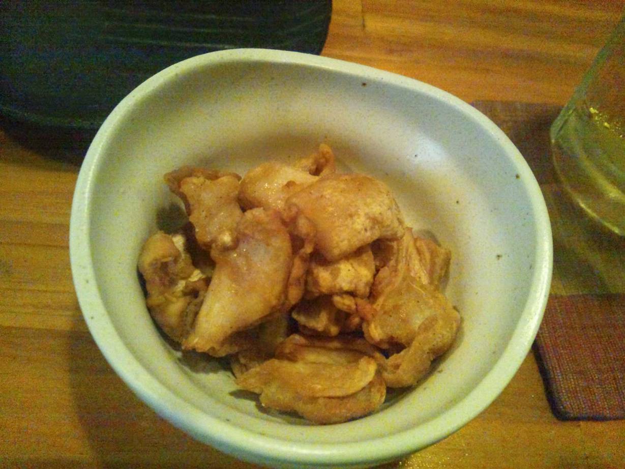 広島市安佐南区西原1-18-11 082-871-5139 今日は夜にちょっと寄り道。 ちょっと気になる新店へ行ってみました。 場所は結構厳しい所にある。 何度かお店が出来ては無くなっている。 今回はどうかなぁ、って思った。 看板には「骨付豚」となっている。 メニューを見ても豚料理がほとんど。 豚がメインなんだね。 お酒も色々あって面白いし、スタッフの人も元気だしいいね。 ちなみにつきだしは南関揚げと小松菜の和えものだった。 南関揚げは熊本のお揚げさん。 ちょっとカリッとして濃い味。 これをまた濃い味付けをしてあったけど懐かしい味だった。 なんだか家族が熊本の人で一文字ぐるぐるなんて出す事もあるんだって。 つきだしが頑張っているお店って楽しくなるね。 自家製せんじから400円。 注文をしてから揚げるせんじから。 食べて「あちっ!」 って言えるせんじからなんてなかなか豪華だ。 味はラードの味がしっかりしていてなかなか美味い。 ビールがすすむし、こちらはそこまで強く味付けはしてない気がした。 ちょうど美味しいと思えるもの。 いいね、最初にせんじからとビールなんて。 ガツ刺し。 値段は不明。 今日のお勧めと言うことで出してもらった。 ガツを野菜とゴマ油で和えて出してくれていた。 好みで柚子胡椒を。 全く癖も臭みもないガツは良い歯ごたえで美味いね。 これは非常にあっさりしていて、それでいてなんだか箸が進むメニュー。 美味しかった。 骨付豚880円。 骨付豚と言うからスペアリブみたいに豪快に、なんて思ったけど切ってあった。 軟骨のついた肉を焼いて切ってくれている感じかな。 脂が甘く味も濃い目。 これは焼酎で食べたら美味しいかも。 肉の脂の甘みがしっかりあるけど、ちゃんと肉の味もある。 これはこれでいいね。 タレは甘い感じ。 ジャンクにも感じさせるね。 これもなかなか癖になる美味さだ。 どれもなかなか良かった。 日本酒も雨後の月や飛露喜なんてあったし、焼酎も500円くらいで中中とかあったっけ。 次もあっさり軽く食べたいな。 リピート必須! ご馳走様でした!