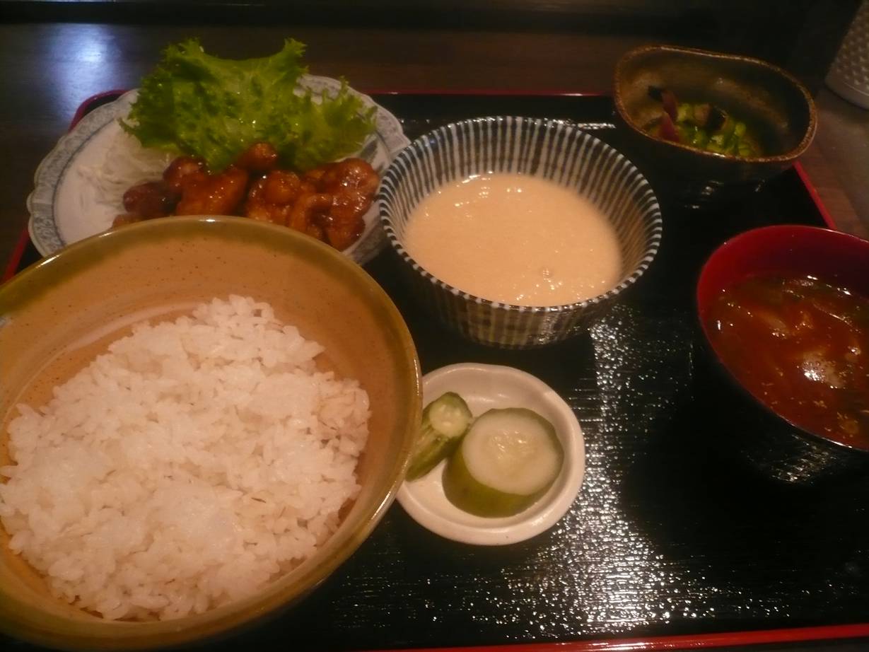 広島市西区楠木町1-11-17 082-295-8816 今日は去年末くらいにできたお店。 実は夜に3回くらい行っていた。 おばんさいをメインにしながらしっかりとしたものも食べれるお店。 ランチもやっていたのは知っていたのだがなかなか行けなかった。 やっと来れた。 ってより日替わりのメニューが梅雨時の辛い時にとても魅力的に見れたので。 入るとお客さんは僕一人。 帰るときまでお客さんは来なかった。 夜のイメージだととてもいい店なのになぁ。 もったいないなぁ。 日替わりランチ750円。 麦飯、とろろ、鶏の旨煮、キュウリと茗荷の酢のもの、赤出汁、糠漬け。 ジメっとして暑い日、そして二日酔いの時になんと嬉しいメニューでしょ(笑)。 鶏は濃いめの味付けになっていたけど野菜もモリモリ食べれるし美味い。 とろろ飯と食べるとちょうどいいね。 とろろの麦飯はさらさらと。 出汁の味もしっかりあっていいなぁ。 キュウリと茗荷の酢のものもさっぱりしていいし、赤出汁は少し山椒の香りがする。 糠漬けも丁寧なものだったし、どれも抜かりなしのランチだった。 美味しかったなぁ。 ってよりもったいないなぁ。 もう少し流行ってほしいな。 次はまた夜だね。 今は鱧づくしのメニューや要予約ですがすっぽん料理もするそうだ。 面白いお店だな。 ご馳走様でした!