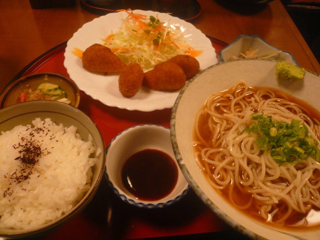 広島市西区横川町3-5-20 082-233-8837 今日は日曜日。 横川の日曜日はわりと開いていない。 特にランチとなると厳しい。 その中で久々にこちらのお店へやってきました。 入ると既にビールを片手に呑んでる方が多い。 小鰯等の魚介系だけでなくホルモンうどんや白肉の天麩羅なんてのもある。 そらいいよね。 最後は白蕎麦で〆るようだ。 羨ましい・・・。 僕はまだ食べた事のない日替わりにしてみる。 日替わり定食(白蕎麦)750円。 日替わりはクリームコロッケだった。 ちなみに味噌汁の日替わりだったら550円。 蕎麦かうどんなら750円になる。 コロッケはクリームが少し重くて懐かしいコロッケ。 小さいのが4個でちょうど良かった。 蕎麦は綺麗な白蕎麦。 好みでと天かすを加えてくださいと言われたがなかなか強さが増して面白かった。 でも無くてもいいかな? しかしこの蕎麦も美味いね。 定食として綺麗な感じだったし美味かった。 次は丼物かな? それか夜もいいなぁ。 ご馳走様でした!