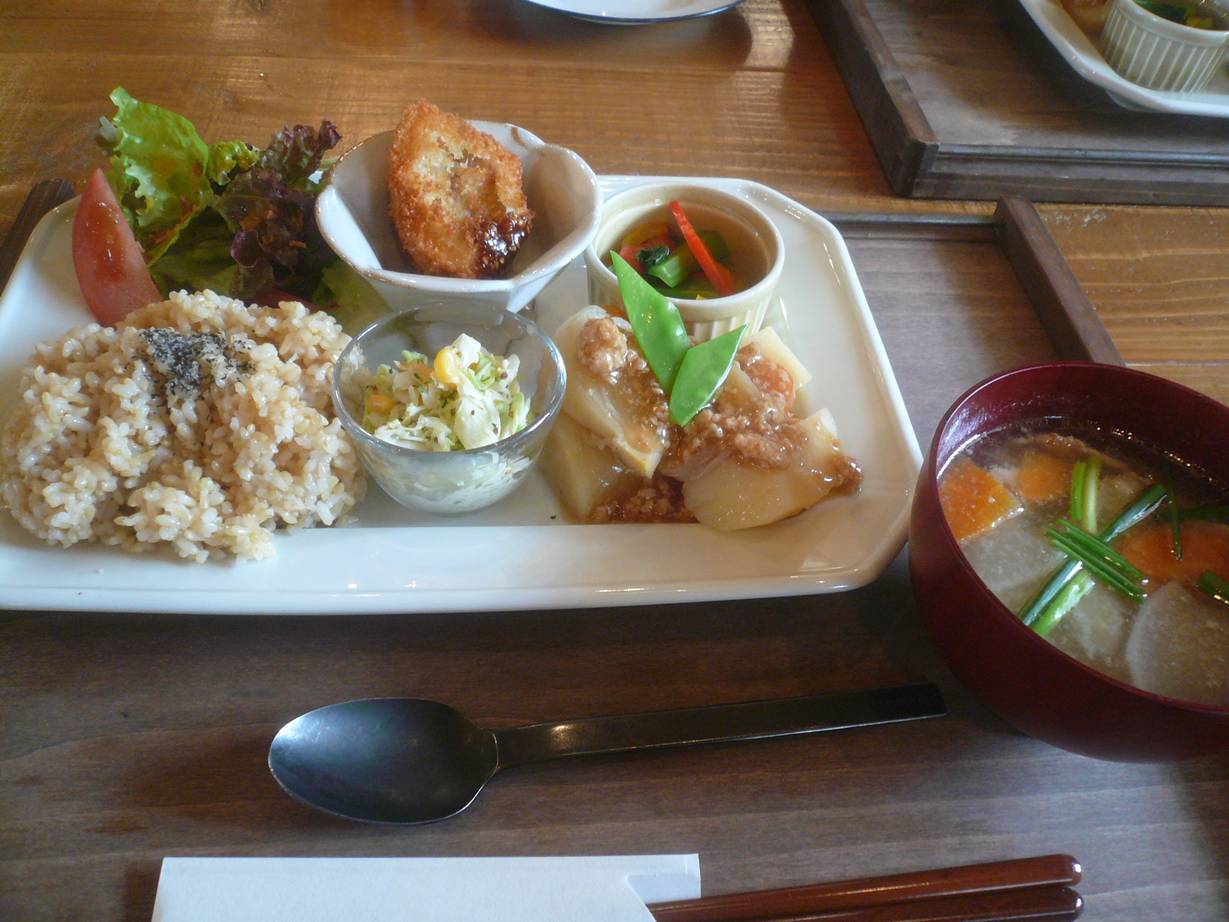 広島市西区商工センター2-7-21 082.961.3452 今日はこちらのカフェと雑貨屋さんでランチ。 こちらはマクロビオテック風に料理を出してくれる。 玄米が美味しいとのこと。 楽しみでやってきたけどお店も綺麗だし、女性スタッフの気配りを感じられていいね。 さてどんなランチが食べれるかなぁ。 ワンプレートランチ850円。 土日限定のワンプレートランチだそうな。 玄米に味噌汁、麩のコロッケ、野菜の炊き合わせ、肉じゃが風のもの、マヨネーズサラダかな。 玄米は大盛りも同値段なので大盛りで。 玄米はもちもちで圧力釜で炊いてくれてるのかな? 美味しいね。 麩のコロッケもカツみたいでなんだか癖になるね。 餡かけ状になった肉じゃがも餡に入ったものはそぼろではなく、大豆たんぱくではないでしょうか? あっさりしていて美味しい。 どれも濃すぎない味付けがいいね。 不思議だったのが味噌汁。 ここまで肉を使わなかったのに、これだけ豚汁だった。 美味しかったけど、あれっ? って感じでした(苦笑)。 でも美味しいね。 居心地もいいしまた行きたいな。 ここなら落ち着いて食べれそうだし。 ご馳走様でした!