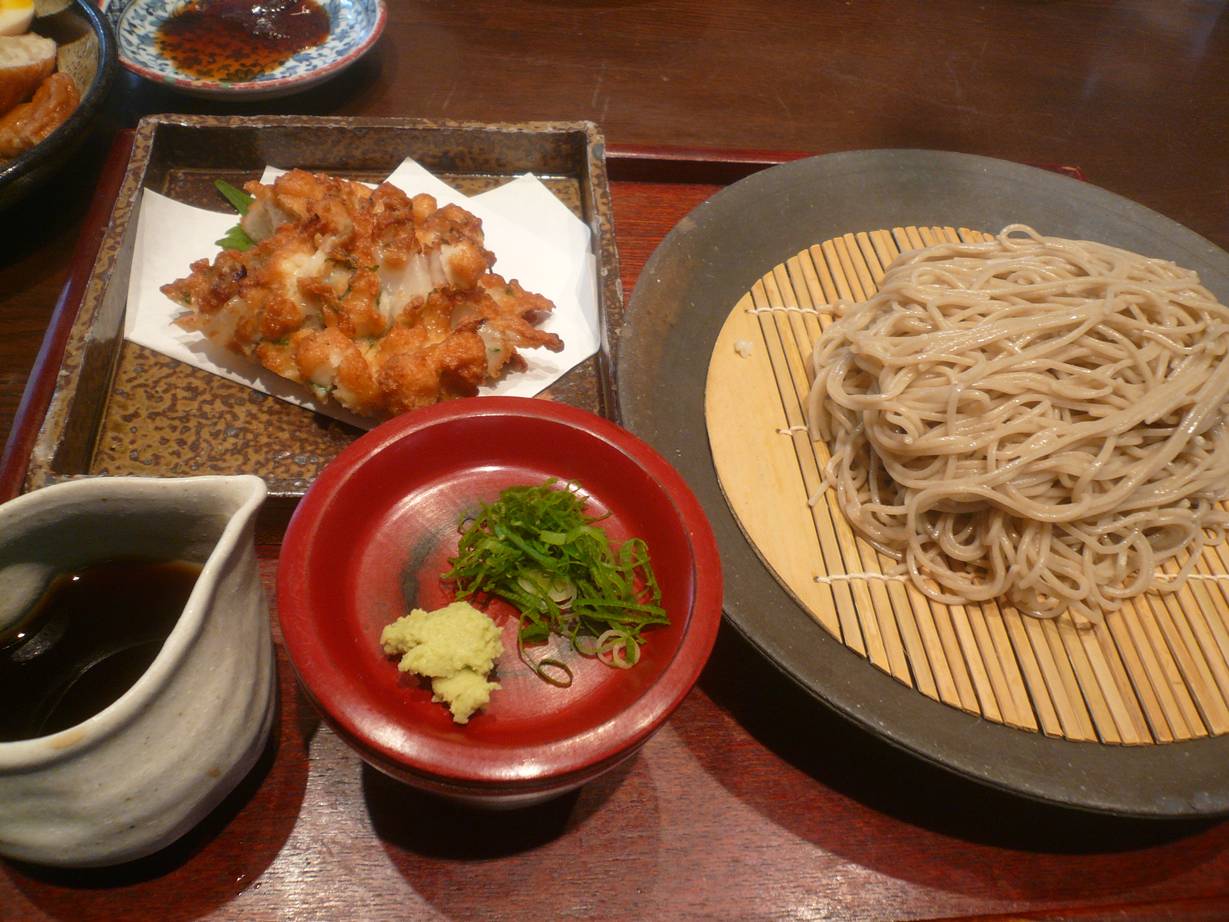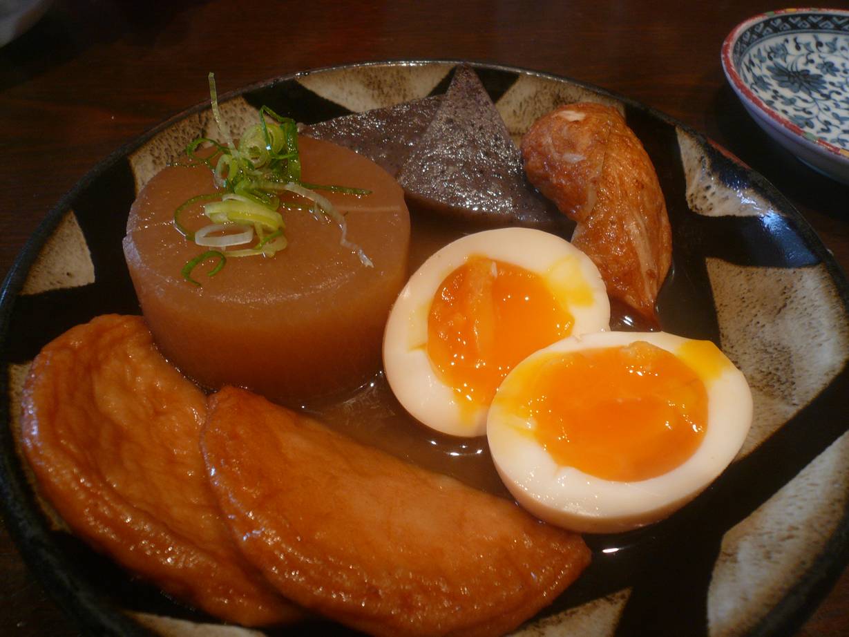 兵庫県姫路市二階町60 079-225-2277 今日は小旅行で姫路に。 さて初めての姫路、何を食べようかな? ってツイッターでつぶやくと姫路おでんを紹介してもらった。 姫路おでん? なんじゃそりゃと思って調べると出てきたお店。 蒲鉾屋さんの2階にあるお店で、蒲鉾屋さんが経営しているそうだ。 メインは蕎麦だけど姫路おでんも食べれる。 姫路おでんとはおでんを生姜醤油で食べるらしい。 どんなんだろう、楽しみだ。 姫路おでん5種700円。 おでんは色が少し濃いめのおでん。 別に壺があり、その中には生姜が凄くたっぷり入った醤油がある。 これで食べるか、柚子胡椒で食べるかと言われる。 まずはおでんを。 出汁がかなりさっぱりしている。 色合いほど濃くなくあっさりさっぱり。 昆布が少し使ってあるのかな? って感じで食べやすくすっと入る。 これだけでも僕は美味いと思うけど生姜醤油もなかなか癖があって美味しい。 醤油は結構とげがあるけど、その癖が逆に楽しい。 特にこんにゃくが良く合っていたな。 焼きおにぎり150円。 これが面白い。 よくつぶされたおにぎりが蒲鉾のような歯ごたえになっている。 もしかしたら魚肉も入っているのかも。 そんな食感でこれは楽しい。 ちょっと出汁をかけて食べても美味しかった。 焼きおにぎりを上手く変形させているなぁ。 蒲鉾屋のかき揚げ蕎麦800円。 かき揚げは蒲鉾のかき揚げ。 これは面白いね。 クニクニした蒲鉾には甘みがあって美味いね。 これをかき揚げにすると香ばしさがでてなかなか。 お酒で食べたくなった。 蕎麦は汁が随分甘みが強くてびっくりした。 硬い腰でちょっと蕎麦っぽくなくて不思議だなぁ。 しかし面白い経験がたくさんできたお店だったなぁ。 平日は定食があってこれを次は食べてみたいな。 ご馳走様でした!