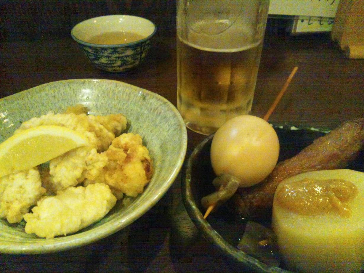 広島市中区橋本町2-27 082-228-7363 今日は久々にこちらのお店へ。 夜に通ると晩酌セットが書いてあった。 おでん3本にビール、一品で690円と言う。 こちらならお得かもしれないな、なんて思って入ってみた。 まぁうどん屋さんの夜は割と空いているかな? なんて思ったけど満員だった。 素晴らしいね。 さてビールを呑みながら待っているとやってきました♪ 晩酌セット690円。 おでんはセルフ。 お腹が空いていたので卵と、大根、ゴボ天をチョイス。 あっさりしていて美味い出汁で食べると美味い。 うどん出汁を濃くしているんだろうか? そうして待っていると揚げものが。 かしわ天とイカ天。 かしわもイカも臭みがない。 綺麗な油で上手にあげていた。 そしてもちろん揚げたて。 こらいいね。 これでお酒一杯で690円はかなり魅力だ。 ひやひや350円。 〆は暖かくなってきたのでひやひやで。 そんなに冷たくせずに軽く締めてあるのでいいね。 もちっとしてずっしりしたうどんでやっぱり美味い。 出汁は軽くてすっきりして美味いよ。 ちょっと切り口が違うけどやっぱり「RENGE」によく似ている。 美味しいうどんでした。 ここはいいね。 また食べないとね。 ご馳走様でした! |