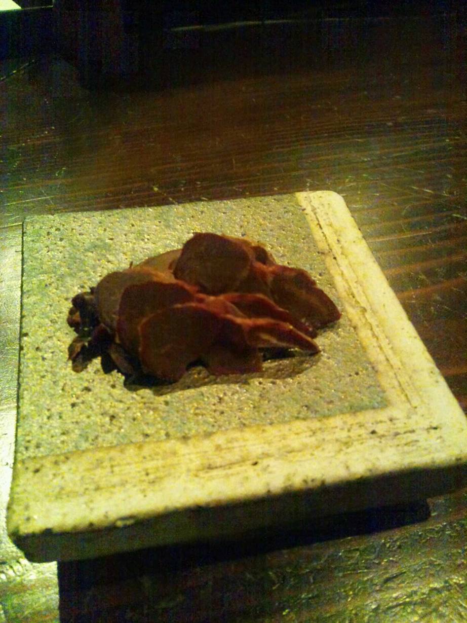広島市中区中町6-30 082-242-1909 さてまたもやふらふらとこちらへやってきました。 ジビエ料理がたくさん並んでたり、魚料理があったり。 野菜メニューがたくさんあったり。 メニューを見るだけで楽しいのだけど、今回一番驚いたのは。 お店の大将がいたこと(笑)。 珍しいことだ。 さて結構呑んでたので軽く頼みました。 筋肉の燻製。 これで300円くらいだったっけな。 筋肉は猪だったっけな? 鹿だったっけな? ほぐれる感じがあって上手く言えないけど美味さがあるなぁ。 噛みしめるとホントに旨味があって。 いいですね。 鹿肉のたたき。 残念ながらハーフしか食べれなかった。 でも充分旨い。 これまた臭みなんて全くないんだね。 脂の美味さではない噛み噛みすれば美味さが広がる素晴らしさ。 ってより美味さの強さが素晴らしいね。 こりゃたまらん! 最後に〆で猪ラーメンを頂いた。 美味いねぇ。 豚骨とかよりあっさりしていて臭みが無いんだね。 旨味はしっかりあるのに。 でも僕は中華麺ではなくなんだか柔らかい麺で食べたかったかな? 癖のない麺で滑らかな感じで食べてみたかった・ でもこんな珍しいものが食べれる幸せ。 ありがとうございました。 また行きます。 ご馳走様でした!!