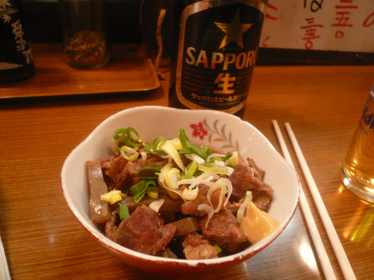 広島市南区的場町1-4-5 082-262-4281 今日は友人から呼び出しをくらってこちらのお店へ。 まだ行ったこともなく。 お店の看板もない。 何のお店で何が名物なのかよくわかない。 聞いてみたら「博多豚骨ラーメン」です。 って言われた。 そのまんまだね(笑)。 でも煮込みものが美味いらしい。 瓶ビールと煮込み(500円+350円)。 煮込みは筋の部分がコリコリしたりとろっとしたり。 ちょっとジャンクな感じだけどビールとの組み合わせがいいね。 柔らかさとか味の濃厚さではなくさらっと感もいいね。 こういったのんびりしたお店で競馬新聞を見ながら、ビールを呑んで煮込みを食べるなんていいなぁ。 次はラーメンを食べなくては。 ご馳走様でした。