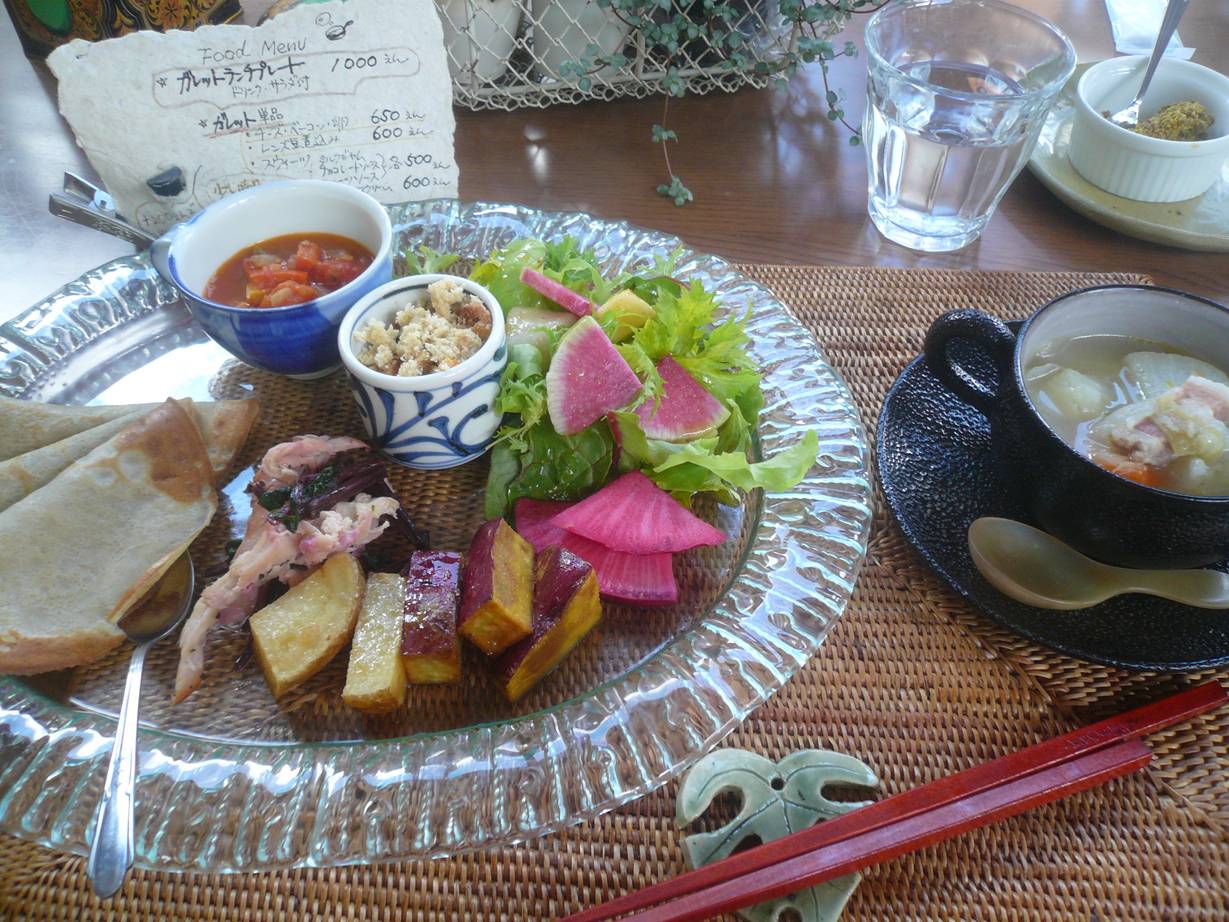 山県郡北広島町今吉田2591 0826-85-1009 今日は蕎麦祭りへ。 なかなか豊平町まで行くことが無いのでドライブがてらプラプラできるのがいいね。 でも今回は蕎麦祭りの前にこちらのお店に行くのも目的でした。 こちらは野菜を作り、その野菜を調理してくれると言う。 子供がいる僕らとしてはありがたい。 お店には犬が居てその犬が可愛い。 ちょっとうちの子はビビっていたが尻尾を振ってすり寄ってくれた。 嬉しいね。 ランチ1,000円。 メインはガレットと言うもの。 蕎麦子を使ったクレープのようなものだろうかな? クレープは甘みが無く蕎麦の香りも弱いがすっきりしている。 これくらいがちょうどいい。 これをチキンやさつま芋、おから、フルーツサラダ。 そしてラタトゥーユでしょうか? どれも強くない味付けなんですが。 バランスがいいなぁ、ってしみじみ味わえる味。 甘みの強いフルーツサラダの中に苦味の効いた野菜が出てきたり。 ほくほくした美味しいさつま芋と思ったら、濃厚なおからさんがあったり。 これをガレットに巻いて食べると楽しくなるね。 その代わり食べてるとちょっと単調に思えてくるのが淡白な味の難しさ。 それを自家製のマスタードで引き締めてくれる。 美味しいね。 からし菜で作ったらしい。 単調な味の芥子と違う酸味もすっきりな感じ。 こりゃいいや。 最後にてんさい糖とエゴマのケーキとコーヒーで〆。 すっきりした甘みで後で胃の重みが出ないケーキ。 コーヒーで暖まるし嬉しい限り。 お店はこの時期と場所がら寒かったので助かった。 これから寒くなって雪が降ると行けなくなるような細い道にあるお店。 ゆったりできて嬉しいが。 なかなか行けない場所だなぁ。 でも機会があればまた行きたいな。 ご馳走様でした!! |