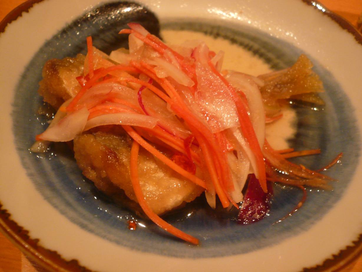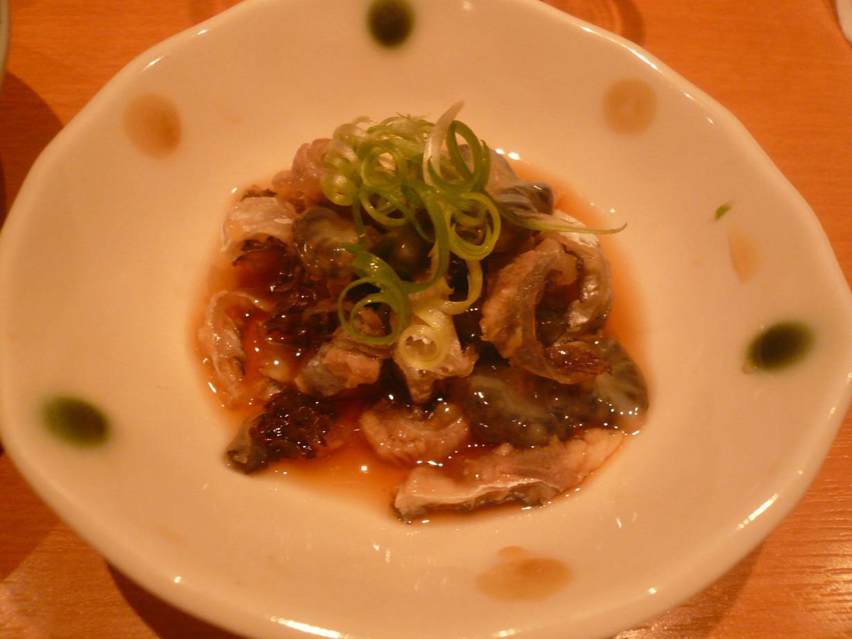 広島市佐伯区海老園2-6-13 082-922-9808 今日はまたまたこちらのお店へ。 いろんな人から今日は面白いものがあるよ。 なんて言われたのでひょっこり行ってみました。 いろいろ有名な方がおられて楽しい会になりました。 自分より知識のある方。 経験のある方。 そういった方のお話をきくのはほんとに楽しい。 自分の底の無さが恥ずかしいが、そんな僕に新鮮な知識を与えてくれます。 料理はどんなんが出るのかなぁ? 楽しみだ。 南蛮漬け。 あっさり少し甘め。 これがいいね。 これからお酒を呑むぞ! って勢いをつけさせるね←僕だけ? 今回は持ち込みの魚があり。 神経〆(神経突き?)で〆た魚たちを捌いてもらった。 もちろん魚は美味しかった。 みんな味がすっきりしていて、でも強さもある。 美味いなぁ。 きっと捌き方も素晴らしかったんだろうなぁ。 ありがたやありがたや♪ タイのアラ炊き。 タイの臭みを残さない自信があるから。 きっとこのあっさり塩ダシでいってるんだろうなぁ。 柚子も効いてるんだけどホントに綺麗な味になっていた。 そしてアラの部分を吸っていると。 ほんとに幸せな気分になれました。 ちょっと塩っぱいけどダシまで飲んで満足満足♪ 皮とナマコ。 ナマコ好きにはたまらないね。 皮はタイ? って聞いたような気がするが、タイとは思えない。 そんなクニクニ感と皮の厚さ。 ナマコのコリコリ感と相まって旨いです。 酸味が軽いポン酢がいいね。 すっぽんラーメン。 ・・・すっぽん!? ・・・すっぽん!?!? ダシが軽く、バカ舌の為にすっぽんを判断できず。 ごめんなさい(汗)。 こってりラーメン。 塩分が効いてて、酒呑みの後には嬉しい。 って言いながらずっと呑み続けていました。 美味しかったです。 とても安かったですし(笑)。 ありがとうございました。 ご馳走様でした!!