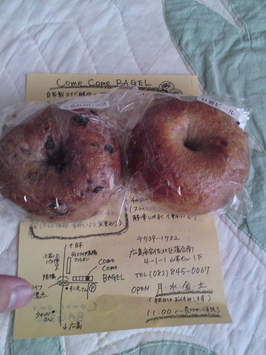 082-845-0067 いろんなベーグルを買ったけど。 ここ、美味いなぁ。 あっさりしていてもちもちのベーグルで。 少しベトベトとした表面がまたいい。 今回は甘夏と黒豆を頂いたけど。 他にもいろいろあったので食べてみよう。 意外とお酒にも合いそうだし。 値段は150~200円くらい。 高すぎないのもありがたいなぁ。 また来ます! ご馳走様でした!