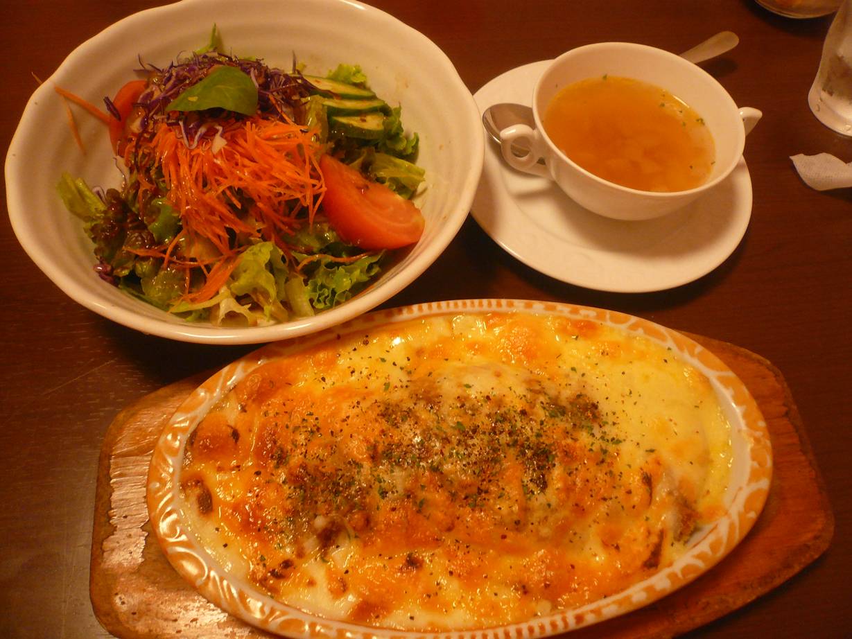 082-236-8222 ドリアで有名なお店に相方と相方の友達家族と行ってきました。 僕も意外と好きなお店だけど、もう食べれないね。 たくさんは。 って思ってると女性陣がたっぷりのセットを頼んでいく。 僕だって、って負けたく無くなるので。 大盛りを(笑)。 『モナコ』の大盛りを680円+150円。 モナコとはチキンライス入りのドリア。 チキンライスはささみたっぷりでライスはしっかり油が効いてる。 そこにチーズ。 こってりして優しい。 ドリアとかグラタンとか。 美味しいと優しさを感じて後で重さに後悔する。 まさにそんな味。 大盛りにするんじゃなかった(苦笑)。 相方はセットで。 サラダ・スープ・ドリア・デザート・ドリンク。 これで1,500円。 あっ、ちなみに僕の単品はミニオニオンサラダが付いてくる。 セットはノーマルのグリーンサラダかオニオンサラダか選べるみたい。 相方はカレーカツドリア。 これには何故か宝塚の名前は付かず。 カツカレーにチーズが乗ってました。 僕は食べきれない。 ・・・歳としか言えないな。 5年前くらいは食べれたのになぁ。 くそう。 ご馳走様でした。