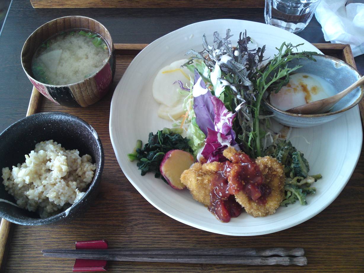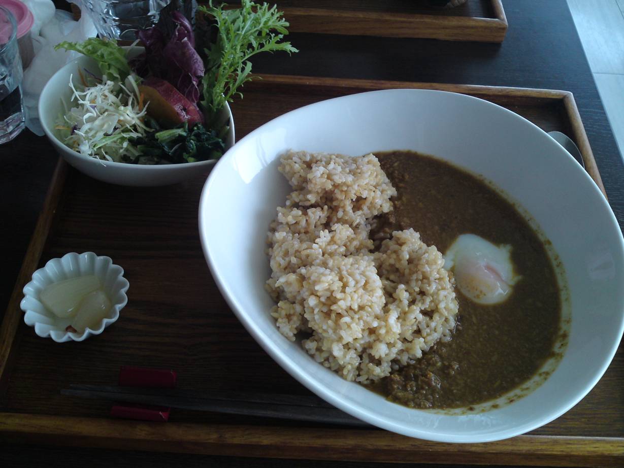 082-555-1180 日替わりカレー850円。 日替わりランチ900円。 デザート+250円。 僕はカレー。 今日はキーマカレー。 自家製野菜のお店と言ってたのに、キーマカレーか(笑)。 意外と辛いカレー。 でも挽肉がメインの割には重さは無い。 さらりと食べれる。 ご飯は圧力釜で炊いた玄米。 もっちり。 カレーには合わないと思うけど嬉しい。 日替わりはメインがカツ。 大豆のカツかな? って思ったけど残念ながら肉だった。 面白いお店だし、太田川が見れて楽しくなる。 でもランチで30分待ちはきついなぁ。 スタッフが少ないのが問題かな。 次に行った時はスムーズにしてもらえたらありがたいなぁ。 ご馳走様でした。