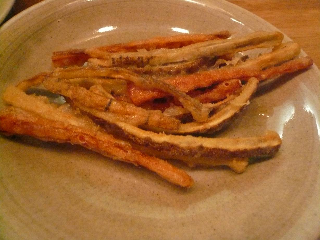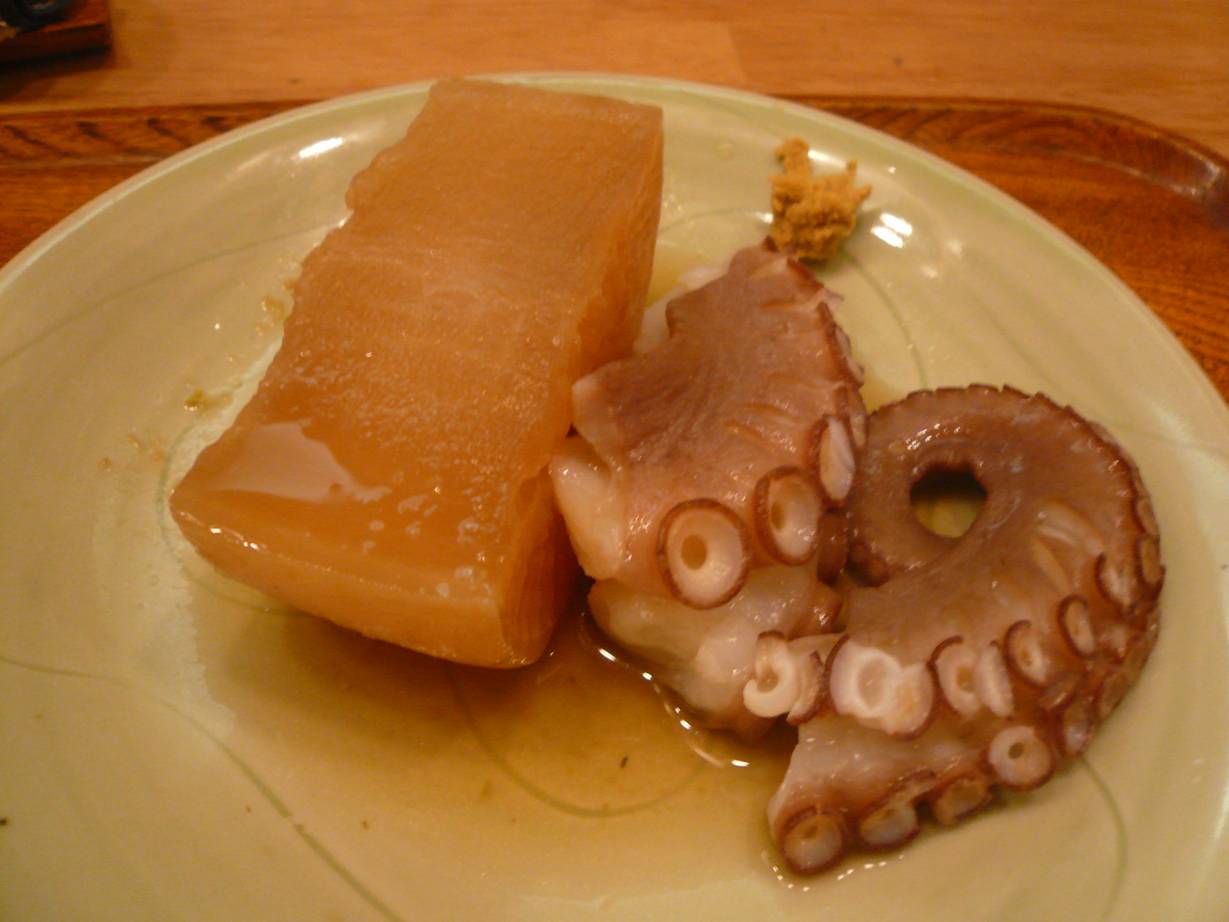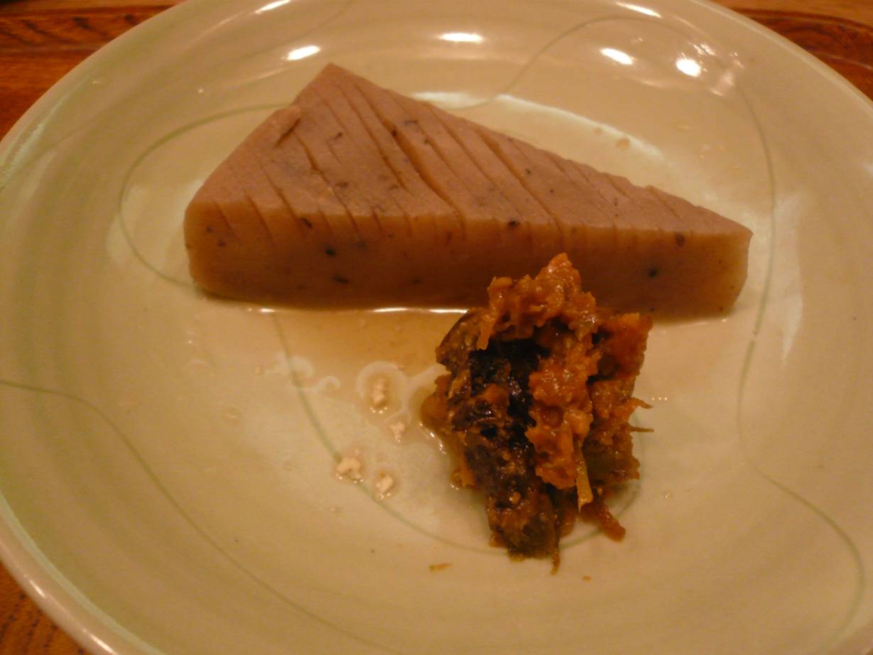 広島市西区横川町2-9-7 082-296-6261 今日はおでん会に参加するためにこちらのお店へ。 あまりこちらでおでんを食べたことはなかったのですが、やっぱり独特の出汁と美味しい具材で楽しませてもらった記憶があります。 さて今日はどんなおでんが食べれるのかな? まずは高野豆腐。 高野豆腐がしっかりしていてびっくり。 軽く切れる感じではない。 柔らかい高野豆腐が好きだったが、こういった高野豆腐はまた独特で旨いな。 硬いと言っても味がしゅんでいないわけではないよ。 しっかり出汁を含んでいる。 出汁は、なんだろう? ちょっと魚介の味と軽い昆布の味がしたがよくわからなかった。 でも飲める美味しい出汁でした! 中には豆腐と野菜が入っていた。 美味しいなぁ。 牛蒡と人参のかき揚げ。 これはおでんではない。 ちょっと冷えてしまったのが残念。 サクッとした感じで無くなってしまったので・・・。 これはこれで旨いって理論もわかるのだが、僕はサクサク熱々が好きだなぁ。 人参も牛蒡もとても旨いんだけどね。 こんにゃく。 味噌にはふきのとうが入っていた。 こんにゃくは以前は分厚いのに凄い歯ごたえで美味しいものだったが、今回は柔らかく食べやすいタイプに。 僕の好みは完全に前回です。 でもふきのとう味噌が旨いだ。 ちょっと塩辛いけど、苦味と旨味が旨く合っててこれはいいなぁ。 これで酒が呑みたくなりました(笑)。 鰤を辛味大根で。 最近山葵ではなく辛味大根で出すところもあるよね。 って思って食べてやはり思う。 辛味大根ってすっきりしていいけど苦味がある。 これって、生魚に合うかな? 僕はやはりわさびで食べたいな。 ブリは脂が強すぎないで旨かったけどね。 大根とタコ。 大根は今回は青首かな。 柔らかく味がしゅんでて美味しいね。 タコは少し生っぽい。 そんな感じで煮ているけど味がいいし、それ以上に香りがいい。 独特の例えようのないタコの香りが素晴らしい。 少し硬いが美味かったなぁ。 ひろうず。 がんもどきですね。 ずっしりと重い持ちごたえがいいね。 味は豆腐のしっかりした旨味に山芋の甘みがあっていいね。 ヒジキや野菜がたっぷりだし美味しい。 ただただ出汁を吸い込んだだけのがんもどきでないのが嬉しいなぁ。 鰆。 ぐはっ。 やっぱり鰆って旨いよねぇ。 しみじみ実感。 あっ、何故だろう? 辛味大根が良く合うなぁ(笑)! 蓮根2種。 蓮根はそのままのどん!っと出ているのは蓮根そのままを煮て、僕らの前で切ってくれた。 ザクっとしてネットリする食感がいいね。 団子になっているのは蓮根だけで作ったらしい。 甘くてねっとりした食感がいいね。 これは蓮根とは思えないなぁ。 きんちゃく。 この中には・・・。 ヨモギ餅が入っていた。 香りがいいね。 おでんの〆にこれってなかなか~♪ 最後は穴子の温寿司。 蒸した酢飯と穴子の組み合わせ。 穴子は独特の味わいと香りがいいね。 酢飯がちょっと酸っぱくて甘みが無いのでちょっとびっくりしたけど美味しかった。 相方はお代わりしたかったらしい(笑)。 しかし美味かったです。 こんなイベントなら何度でも行きますよ! 楽しみだなぁ。 ご馳走様でした!!
