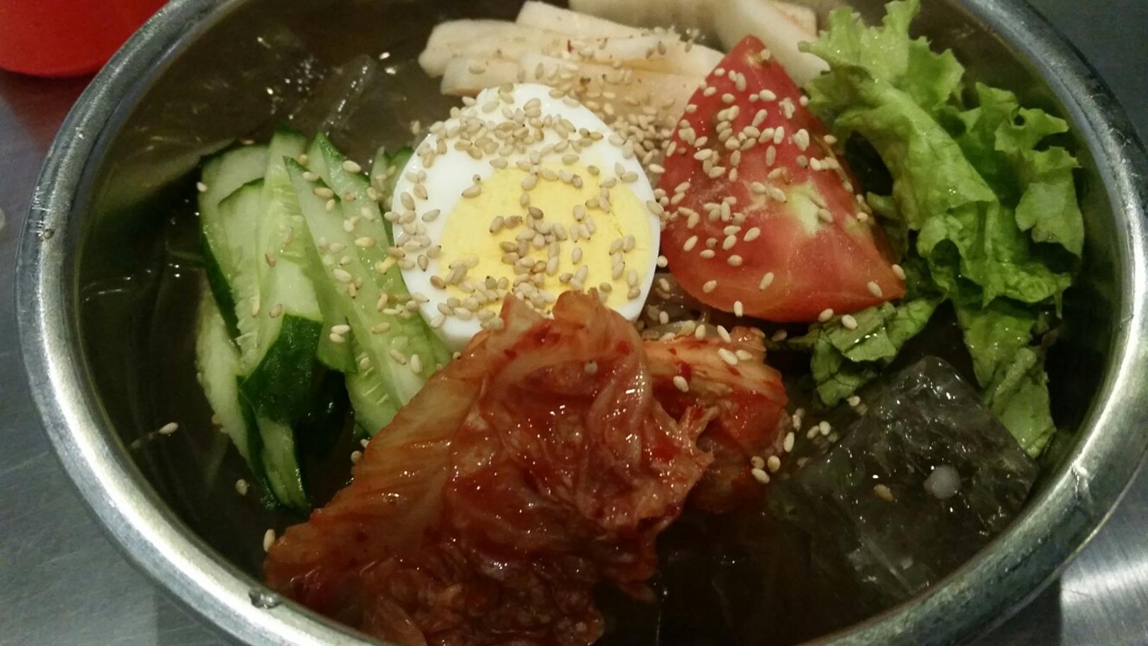福岡市博多区店屋町3-35 092-291-6188 今日はランチを食べにうろうろしていると見つけたお店。 お店を探していると汗もかいてくる。 こんな時は冷たい麺でもと思い、韓国料理のあれを。 お店は焼肉料理店というべきなのか。 店内にコンロや煙を吸い寄せるフードが揃っている。 焼肉を食べている人も多いけど僕はこちらを。 冷麺700円。 具だくさんの冷麺が出てきた。 麺が見えないくらい具が入っているけち臭くない料理は好き。 野菜がメインで肉なんてないのがいいですね。 麺は少し茹ですぎというか柔らかすぎるのが少し変な感じがするけどいいですね。 スープはかなりジャンク。 ってより冷麺で個性を出すって難しいんだろうな。 でも身体は冷えたし嬉しいランチでした。 次は焼肉系を食べてみようかな。 ご馳走様でした。