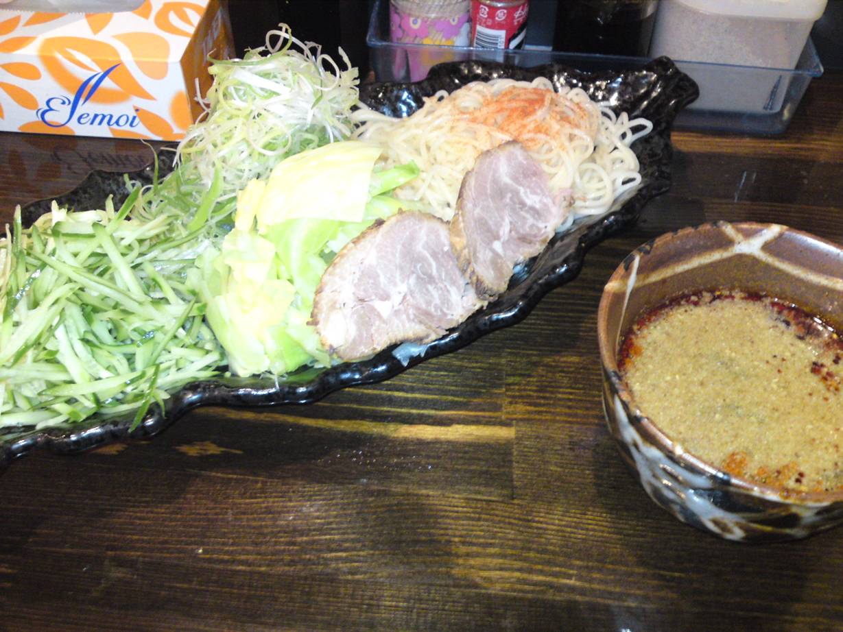 広島市安佐南区大町西3-11-3 082-877-4731 今日は以前からこんなところにお店があるんだぁ。 って思ってながら言ったことの無かったお店へ。 広島風つけ麺のお店、ってことは分かっていたけどよく見るとつけ麺居酒屋と言うカテゴリーらしい。 入るとお酒のつまみのような料理が多いし、おでんも100円である。 なんだかちょっとつけ麺屋さんっぽくないね。 つけ麺は量や辛さが選べるシステム。 まぁ僕はあまり辛いのは強くない方だから、お店のお勧めでっと。 つけ麺750円+野菜大盛り100円。 綺麗な盛り付けで嬉しいね。 キャベツ・ネギ・キュウリもたっぷり。 麺は癖のない中太麺で癖が無くもちもちしていていいね。 汁は酸味が少し感じる汁でさらっとしている。 辛さは3辛でお願いしたが全く辛くない。 これはどうしたもんか、って思い5辛に途中でしてもらった。 どろっとした唐辛子が上に乗っていたが5辛でも大したことはない。 さらっとしたものがするすると食べれるイメージ。 お酒の後の〆に食べるにはいいのでは。 2枚乗ってたチャーシューはちょっとジャンクかな。 でもこういったさらっとしたつけ麺もたまに食べたくなるね。 次はお酒を楽しんでから最後に食べてみたいな。 ご馳走様でした!