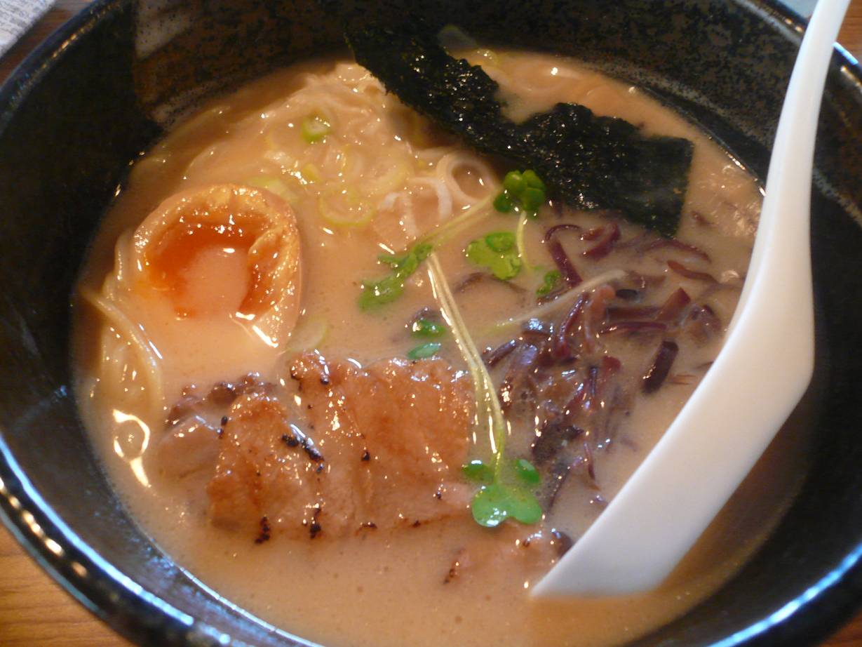 広島市中区宝町4-13 082-246-7288 今日は噂になっていたこちらのお店へ訪問。 福岡で有名になってたお店の2号店がなんと広島にできたとのこと。 ツイッターでかなり大きく噂になっており、行った人行った人が「旨い!」と書いているではないか。 ちょっとどうだろうなぁ、なんて半信半疑だったけどここまで言われたら行くしかないでしょう! ってことで後輩を連れていきました。 店に行くと何故か水風船かなんかのつり遊びができたりしていた。 新店オープンで並ぶ間の遊びかな。 スタッフの人の声出しもいいしなんだかそれだけで気持ちよくなる。 こういった雰囲気作りも大事よねぇ。 黒豚ラーメン680円。 ツイッターでは高い高いと言われていたけどそうだろうか? 最近これくらいの価格帯が多くなってる気がするのだが、ラーメンは。 スープは豚骨の濃度がしっかりあるスープなのに引っかかるものが無いなめらかさがあるね。 最近行った『サクラ』さんも濃厚系だったし雑味の無い素晴らしいスープだったけど、濃厚さがはっきり感じる重い強いバランスの味。 こっちは豚骨でとろみもあるくらいなのに軽ささえ感じる面白いバランスの高音な雰囲気でバランスがいいスープ。 これは旨いな。 なんだか止まらなくなるスープで旨い。 麺は細麺で硬めに茹でてくれてるね。 これ以上に硬くするとなんだかまたバランスが悪くなる気がするのでノーマルで茹でてもらった方が好みかな。 チャーシューはサクッとした感じでほろっと繊維が切れるラーメンではあまり食べたことのない美味しいチャーシュー。 僕は好きだなぁ。 いい店ができましたね。 次は相方も連れて行きたいな。 感想を聞きたいよ。 ご馳走様でした!!