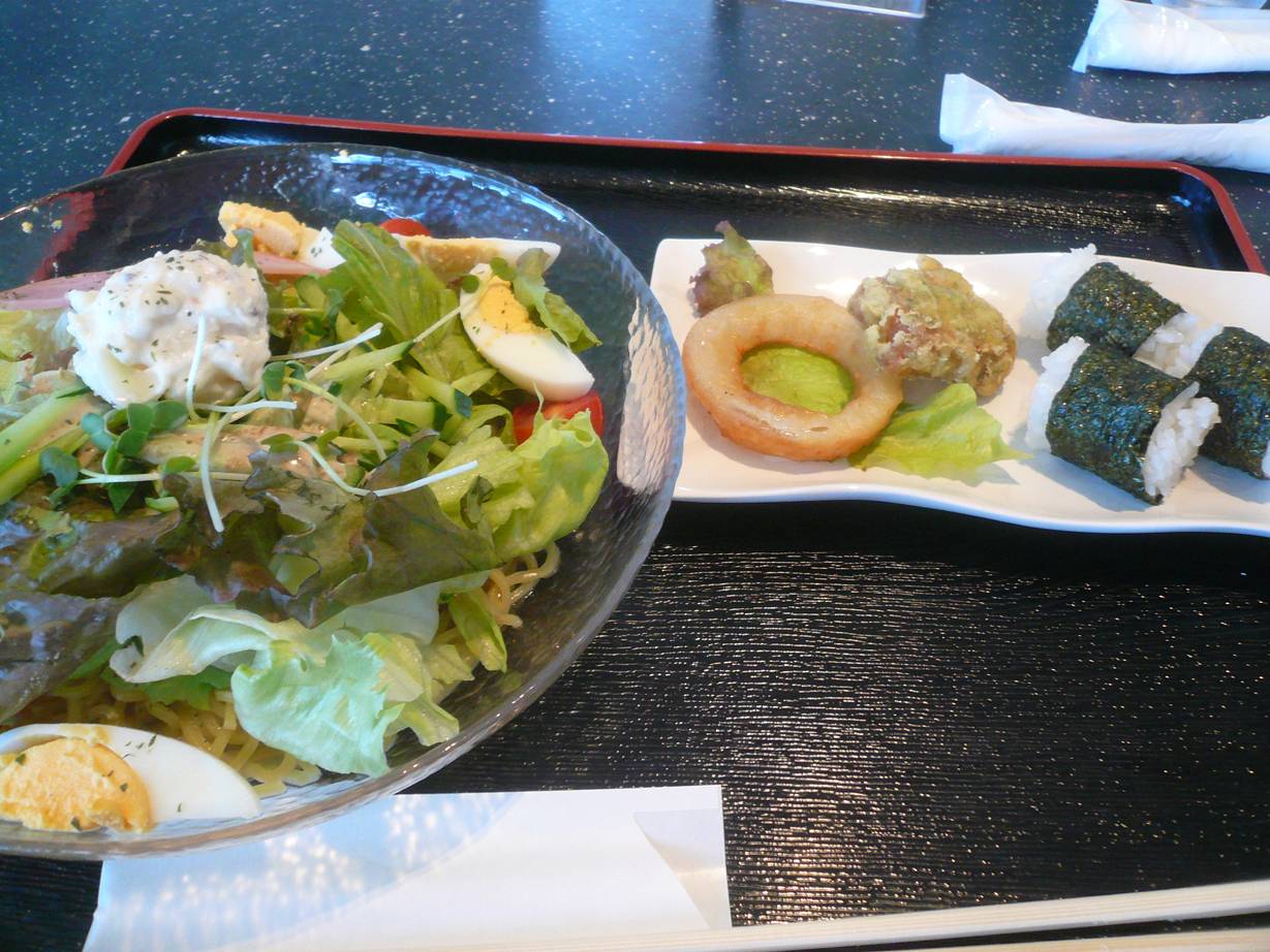 奈良市三条大路5-257-2 0742-34-5102 今日は親と軽く喫茶店でランチを。 よく親が行ってるらしい。 入ると店舗が広く使われていてありがたい。 店が綺麗でありがたい。 新聞が多くてありがたい(笑)。 こういった味以外の部分も大切な話。 特に居心地が大事な喫茶店には特に大事。 ランチ800円。 ハンバーグと選べたのだが冷やしサラダラーメンをチョイス。 一緒におにぎりとフライが付いてくる。 ラーメンはポテトサラダと葉物のサラダがゴマだれで和えてある。 そこにつるつるした麺と食べるもの。 う~ん。 これって冷やし中華ではないの? なんて思う。 スープは飲める感じはない。 麺も特に特別感もないし、まぁ冷たくなってて食べやすかった。 おにぎりは具無し。 味付け海苔が関西風。 フライは竹輪と玉ねぎ。 ザックザクの食感で面白かったかな。 ゆっくりできたのはよかったね。 次は別のランチを食べたいな。 ご馳走様でした。