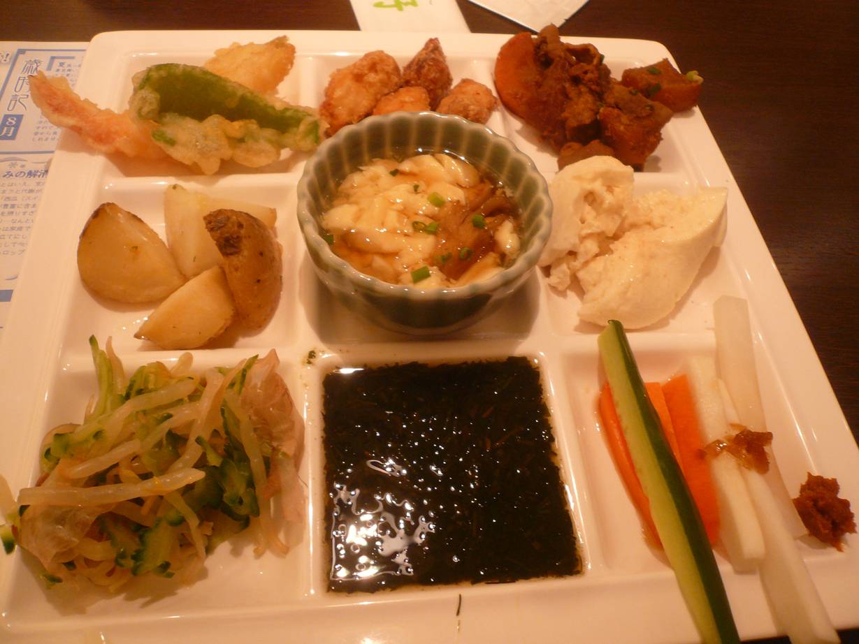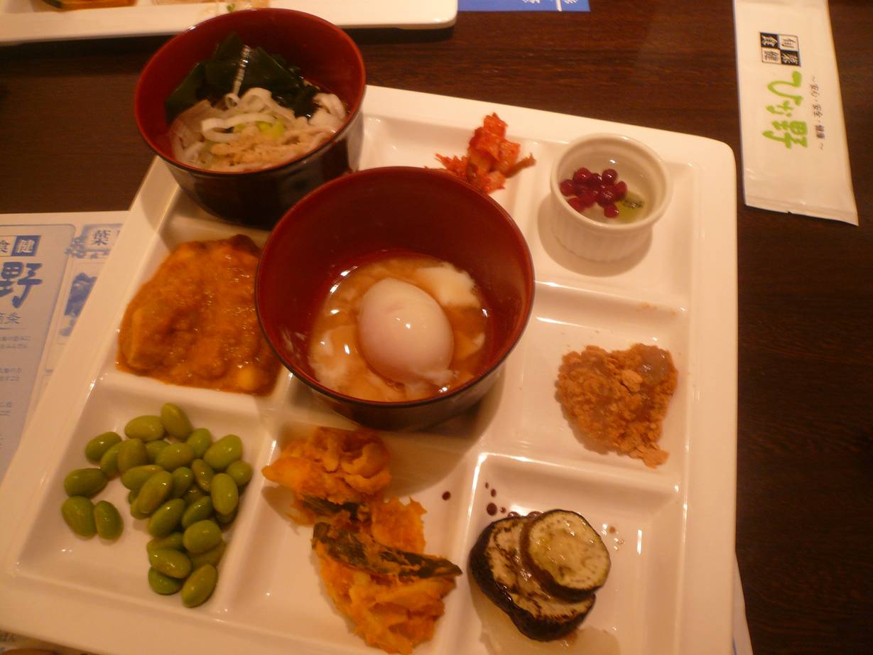 大和郡山市下三橋741-141 0743-58-1831 今日は大和郡山に新しくできたイオンモールのお店でディナー。 どこにしようかとうろうろしていると見つけたお店。 自然食をうたっているバイキング形式のお店みたいだ。 入るといたるところに「有機特別栽培の野菜」や「化学調味料不使用」 なんて見える。 なんだかどうなんだろう? って思うなんだけどなぁ、こういった文章って(苦笑)。 ディナー2,100円。 いろんなメニューを選べるということでこんな感じ。 お代わりではこんな感じ。 とりあえずあまり有機農法の旨い野菜! って感じもしない。 化学調味料もたまに、うん? って思うものもある。 でも野菜中心にこういったお店をやってるのは素晴らしいと思った。 ぎばさ、なんて海藻は秋田でしか食べたこと無かったのにしっかりあったし。 出来立てなのも嬉しい。 回転がいいからだろうな。 近くにあってもう少し安かったら通うなぁ。 いいお店だと思った。 ご馳走様でした!