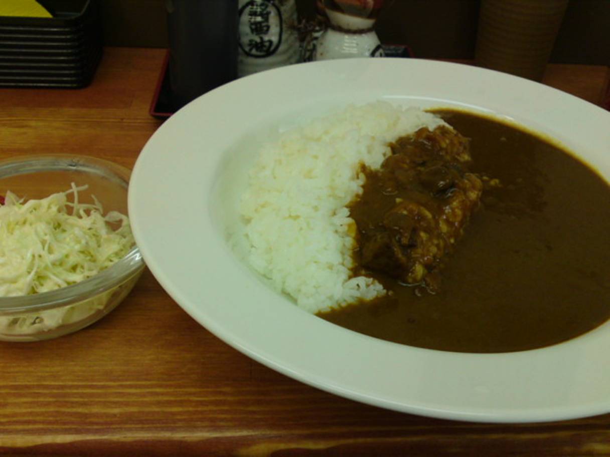 広島市西区三篠町3-7-10 今日はランチでカレーを食べに。 そう言えばここにカレー屋さんができていたな。 なんて思って行ってみた。 仕事の人も「カレー、カレー」なんて言ってたので連れて行く。 しかし入るとなんだかお弁当屋さんの雰囲気。 そうか、以前はほんとに弁当屋さんだったよね。 ご主人さんが一人でやってる感じでわりとのんびりやってる雰囲気。 まぁ、大きな期待はしないで良さそうな雰囲気が嬉しい。 カレーライス(大)650円。 牛肉がころころ入っているカレーですね。 食べると何となく懐かしいというか家庭的なカレー。 スパイス感とかはあまりなく、少し重いけどなんだかご飯と食べる悪くない。 真っ赤な福神漬けと食べるとまた楽しくなる。 ちなみにカレー(中)で500円。 これなら安いですね。 トッピングもたくさんあるのでチョイスしたら面白いな。 あと小さなサラダも付いてくるのも嬉しいね。 次は定食もいいな(500円である)。 ご馳走様でした。