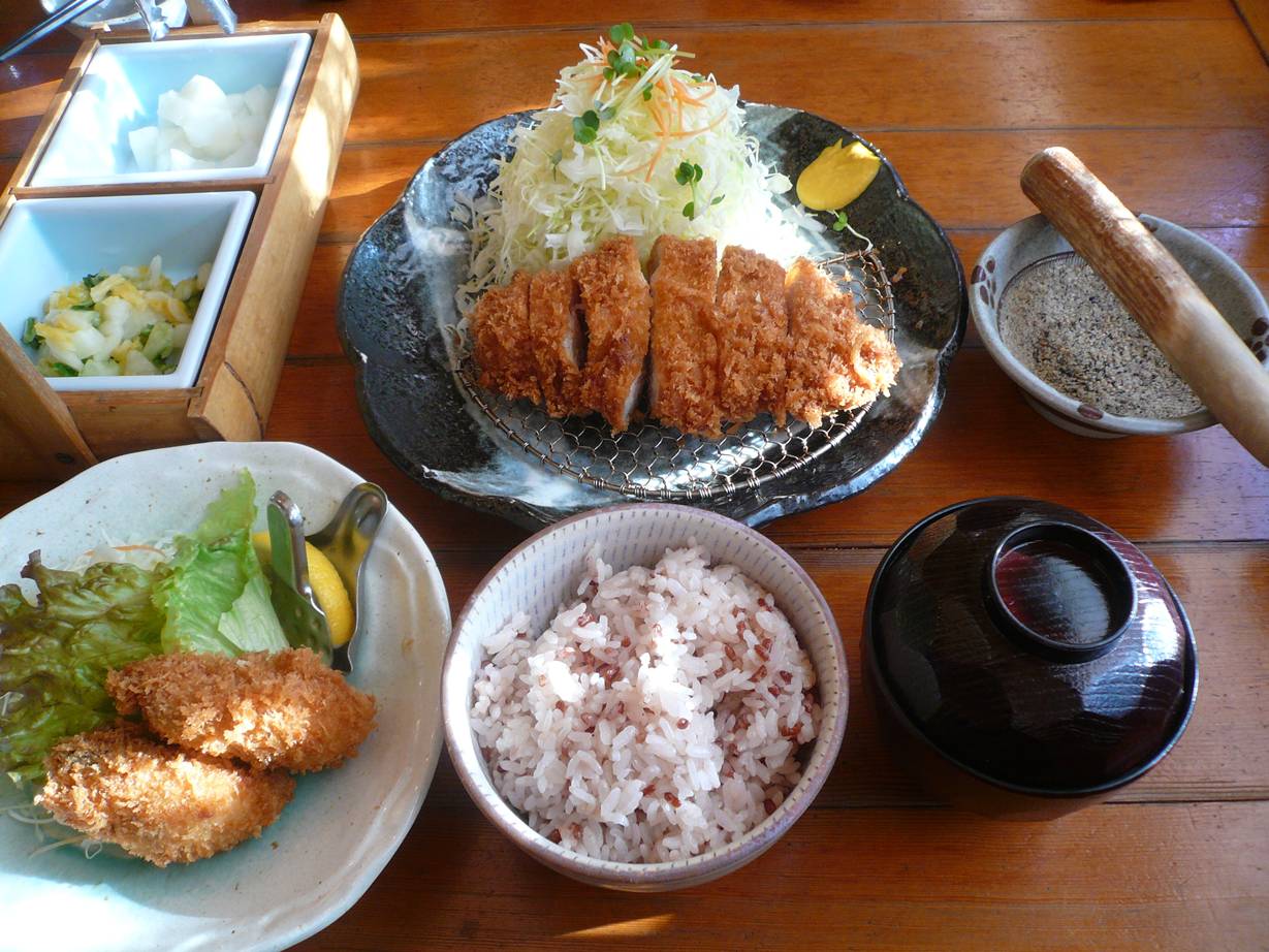 広島市安佐南区中須1-8-12 082-831-6898 今日もまたとんかつを食べたいと言われてやってきましたこのお店。 日曜日は昼休み無しで働いてるので15時前に行ったけどお客さんが結構いる。 凄いな、相変わらず。 美味しいとんかつ屋は時間も関係なく人が押し掛けるのですね。 柚子味噌とんかつ(ロース)牡蠣フライ・温玉付1,480円。 柚子味噌が煮えくり返ってる(笑)。 とても甘くて香りがいい柚子味噌が特徴か。 とんかつは小さく切りそろえている。 食べているととんかつって甘い味付けにもよく合うなぁ。 とんかつは前回と違いすじが少し気になるが味が濃くて旨いなぁ。 カキフライは、う~ん。 少し水っぽいというか味が薄いというか香りが薄いというか。 やはりとんかつ屋さんはとんかつだね(当たり前だけど)。 旨い旨い、って思ってたらだんだん味噌が煮えてきて濃くなっている。 ここはきついな。 しかしここのお店はお茶は2種類(蕎麦茶とあと香ばしい香りのお茶)が出てくるのでかぱかぱ飲んでしまう。 おかげでお腹いっぱい(笑)。 黒豚ロースとんかつ定食1,480円+牡蠣フライ2個380円。 こちらも最初は油切れが少し悪かったり肉質が少し筋を感じたりするけど何故かやはりうまい。 肉の種類がやはりいいのかなぁ。 相変わらず漬物も旨いし(4種類)味噌汁も旨かった。 ご飯も赤米を選んで旨かった。 やはりいいですね。 ご馳走様でした!!