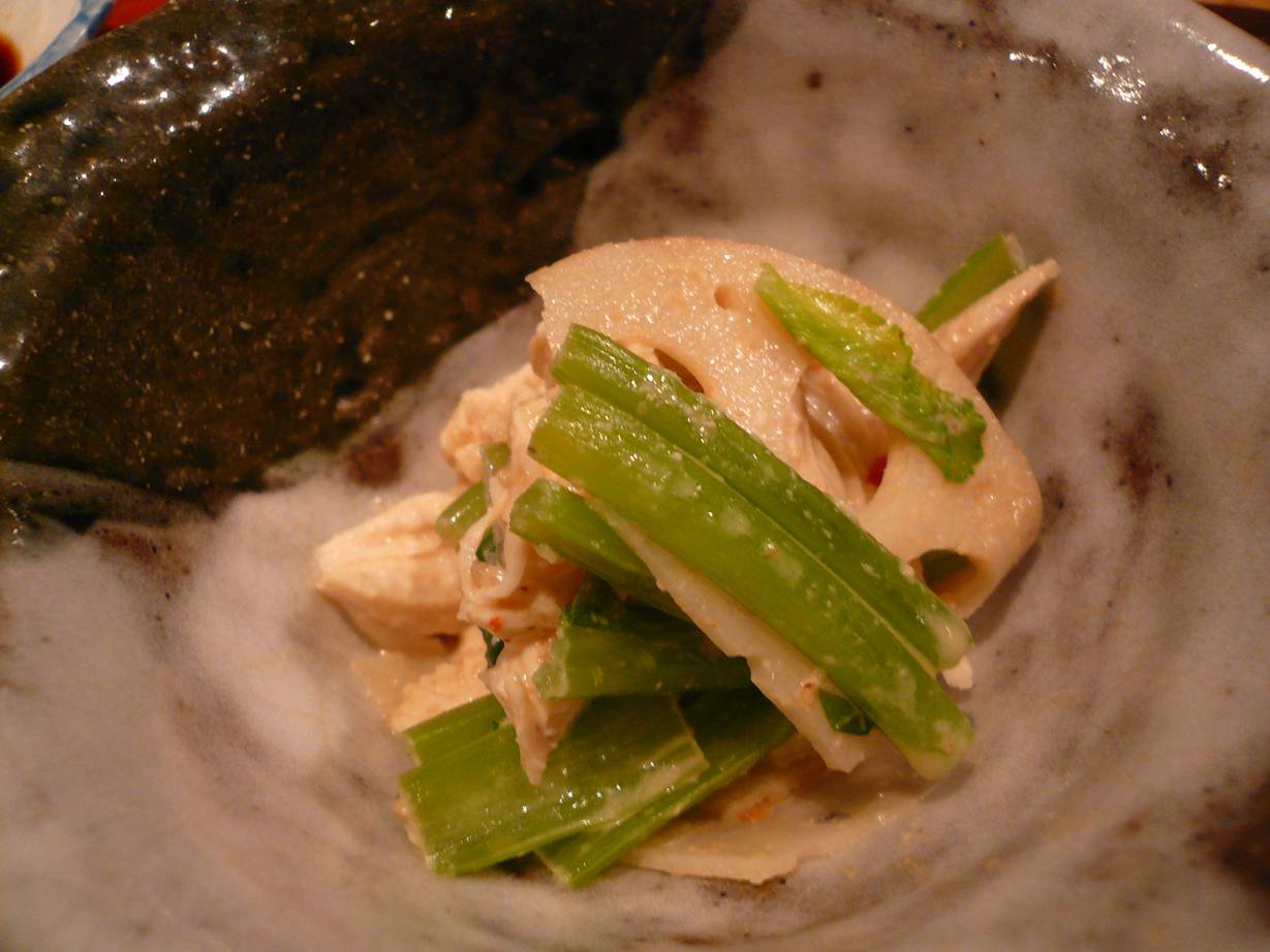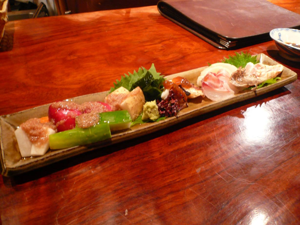 広島市中区富士見町4-28 082-249-0366 今日は以前から行きたかったお店へ。 居酒屋さんとして、ってより和食のお店としてかなり名前は聞いてましたが、一度振られて以来行ってなかったお店。 入るとカウンターで炉端焼きのようにガンガンいろんなものを焼いていた。 これは旨そうに見えますね。 目で満足。 さてご馳走は? つきだし。 レンコンとささみかな? それに青物を和えてる。 ゴマの甘さがすっきりしていて、いいつきだしです。 刺身盛り合わせ ここの刺身盛りは面白いですね。 魚だけでなく(魚はタコやタイなんかが旨かったなぁ)、野菜や肉もある。 野菜はどれも濃いしっかりとした野菜ではなく爽やかな感じ。 これは好みもあるだろうけど、ちょっとしっかりした野菜が良かったかも。 これは時期もあるのだろうけど。 肉は鶏。 これも柔らかな肉質のたたきになっていて筋っぽさはなし。 すっきりしてて旨い。 ごま豆腐をお勧めされたが、頼むと品切れだった(無念)。 代わりにどうですかと言われた湯葉。 湯葉は甘く香りがいいですね。 これは贅沢ですね。 そのうえウニが乗っていた。 塩辛のウニ。 これは酒のあてにいいですね。 目の前で焼いてあった甘辛唐辛子をいただく。 甘辛と言うが辛味はなくすっきりした唐辛子の風味がいいですね。 正直鰹節はいらなかったくらいですね。 これって目の前で焼いてくれるから誘惑されるんですね。 ずるいなぁ(苦笑)。 蒸し野菜。 夏野菜をシンプルに蒸しただけのメニュー。 ニンジンなんか皮つき。 それをニンニクを効かせたタレで食べる。 これは旨いよね。 ずるいなぁ、って気をさせるメニュー。 野菜が旨いんだもん。 笑いながら食べれました。 酒を呑んでるとどうぞ、と言われて出されたわかめ。 ぶれて見にくいがわかめに焼いた海苔が乗ってる。 香りでやられる。 とろとろのわかめとカリッとした海苔がいいですねぇ。 いいアテをありがとう♪ 最後に甘夏ゼリーをいただきご馳走様。 甘夏も酸味が軽く甘みもあって旨かった。 ゼリーにすると香りがぼけそうだけどそんなことなかったなぁ。 美味しかったです。 それに思った以上に高くなかったし(一人4,000円くらい)。 ありがたいお店ですね。 人気なのも分かります。 次は焼き物を中心に頂きたいなぁ。 ご馳走様でした!