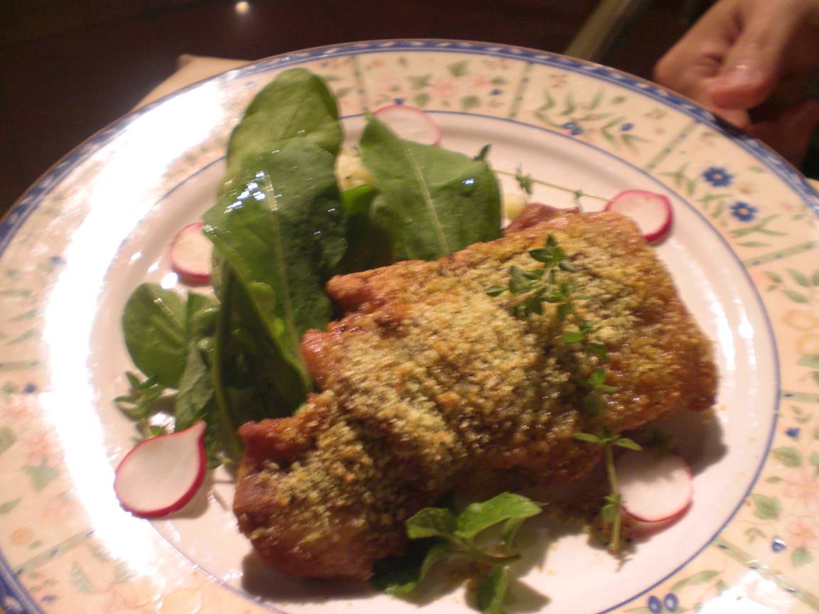 広島市安佐南区緑井6丁目21-1 082-870-5877 今日は以前から行きたいと思っていたイタリアンのお店。 パチンコ屋の3階にあり(さらに上の階にはボーリング場がある)、明るいイタリア人シェフが頑張ってるお店。 いや、イタリア人の人かどうかは分からない。 って言うのもTシャツに映ってた言葉が「FRENCH」だった(笑)。 今回はまた羅列で。 3,000円のコースを2人前。 まずは前菜3種。 いろんなものが並ぶがチーズやトマト、塩がどれもしっかり効いてる。 パスタはカルボナーラ。 少しぼってりしてるのが気になる。 でも黒コショウが効いてるところはいいアクセントで良かった。 アマトリチャーナ。 トマトとパンチェッタのパスタ。 非常にこちらも濃厚。 ちょっと酸味が効いてたら嬉しいが、濃厚さで全てが分からず。 ちなみにチーズを混ぜたらさらに濃かった(笑)。 ピザはシーフードとマルゲリータ。 うーん、トマトが濃厚。 チーズもしっかり。 そしてボリュームが素晴らしい(でかい)。 これは嬉しいなぁ。 パリッとしていて食べやすかったし。 魚は太刀魚。 皮の部分が明確に旨くこれはいいですね。 ソースも強くないので食べやすいし。 チキン。 塩がかなり効いててはっきりしている料理。 チーズやパン粉の味もしっかりしていて旨い。 ただやはり濃い。 パリパリだから進むが濃いのが気になるなぁ。 オレンジのババロア。 これで終了。 酸味・苦味が効いてて旨い。 これに最後はコーヒーか紅茶がつく。 あとパンは食べ放題。 こりゃ腹いっぱいになるなぁ。 この腹いっぱいサービスは嬉しいなぁ。 次はランチで行きたいな。 ご馳走様でした!