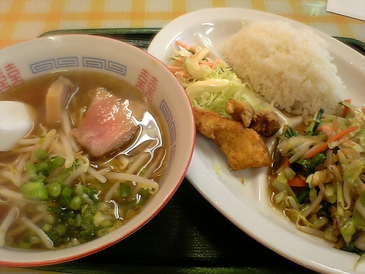 広島市西区横川町2-8-3 082-293-8890 今日は少しご無沙汰のこのお店でランチ。 う~ん、いつも思うのだけどもう少し流行ってもいい店だと思うのだが。 ボリュームもあるし値段も手ごろだし。 今日もわりと空いてた。 まぁ客としてはすぐに料理も出るしありがたいが・・・。 日替り定食650円。 今日は野菜炒め。 それにラーメンまでつく。 ラーメンは以前ほど生醤油の香りが気にならなかった。 胡椒なんてかけたら旨いかも。 なんて思って食べてました。 実際はかけなかったけど(苦笑)。 野菜炒めはまぁ食べやすく野菜がたくさん。 少し汁がご飯に侵略するのがナンだけど・・・。 お腹もいっぱいになるしやはりいい店だと思う。 次は一品ものをいただこうかな? ご馳走様でした。