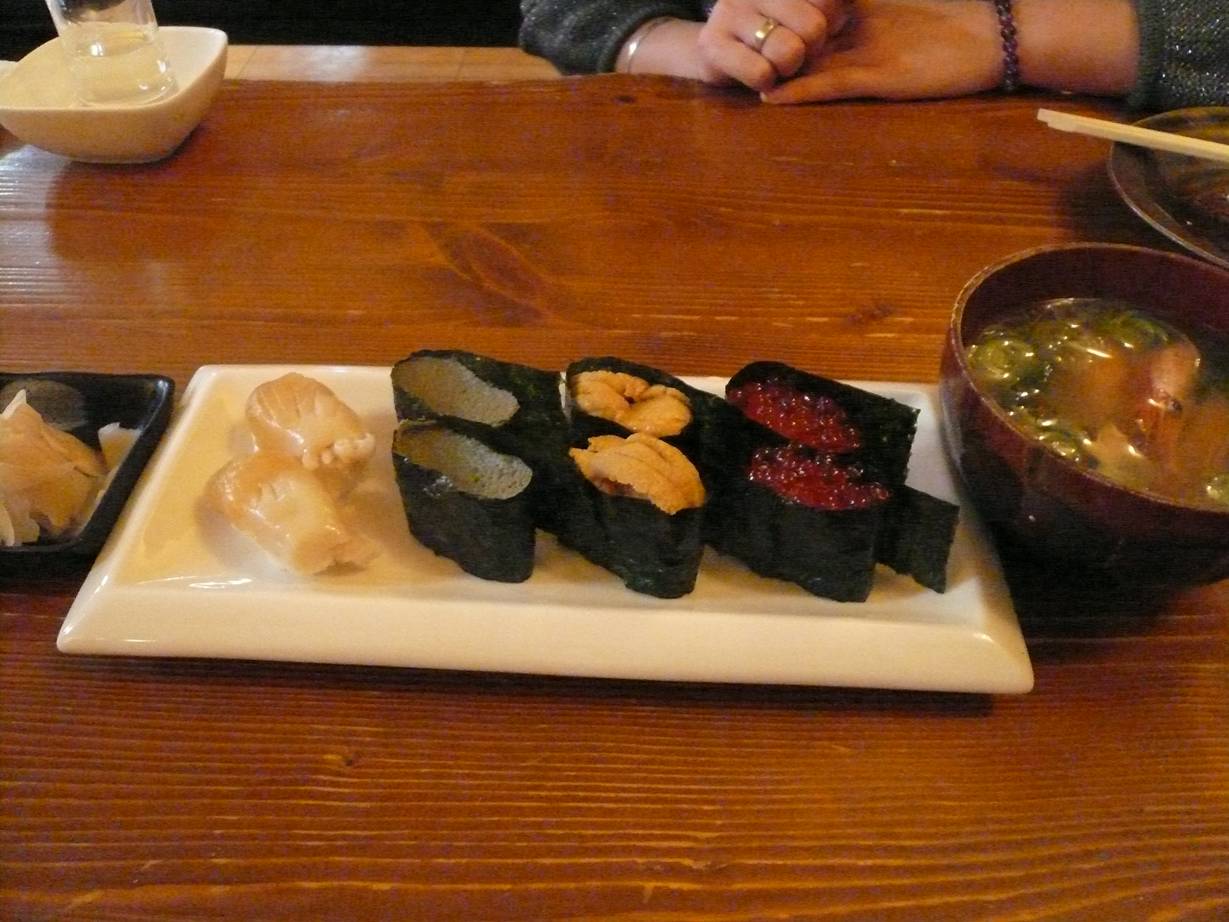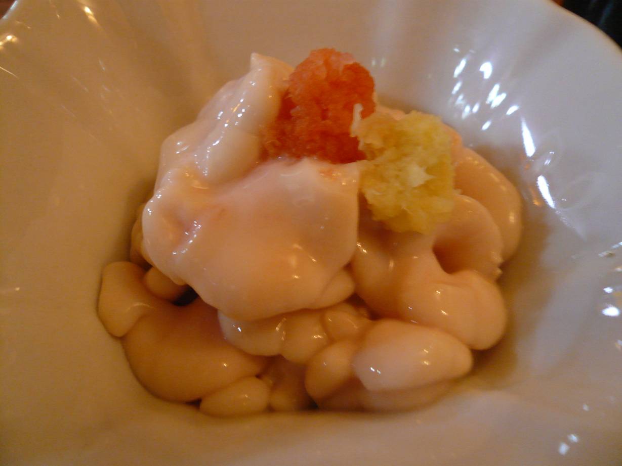 由利本荘市御門110 0184-24-1213 さて、また来てしまった。 何回言ってるのだろう、このお店(笑)。 地元の人よりも来てるかも。 その理由は・・・。 この酒の量! 携帯電話(結構一般的な電話)と比べてこの量で、あふれる量も見てください。 ありがたや~。 豪快や~!! 酔うわいな~(笑)! さて、いつも通りの刺盛り。 左上よりマグロ赤身・タマゴ・イカ(種類不明)・ヒラメ・ノドクロ・甘エビ・北海つぶ貝。 ノドクロ都は贅沢な。 とろっとした食感がなかなかいい感じ。 北海つぶ貝の内臓も臭みはなく、身はこりこり。 楽しくて笑えてきます。 でへへへへっ。 だだみ。 そう、鱈の内臓。 やはり地元のものは甘いし旨いです。 なにも味付けをしてないので醤油を少しだけかける。 それだけで充分である。 ちなみに何も書けずに食べると甘いがやはりしまりがない。 醤油って大事ねぇ。 小さく切ってもらって揚げてもらっただだみ。 熱くなるといきなり爆弾になる。 熱くてびっくり! そして香りもいいしとろっとしてて旨い。 そして寿司で〆る。 またカニみそ、うに、いくら、つぶ貝。 うまいうまい、旨いぞ! あ~ご馳走様でした!! |