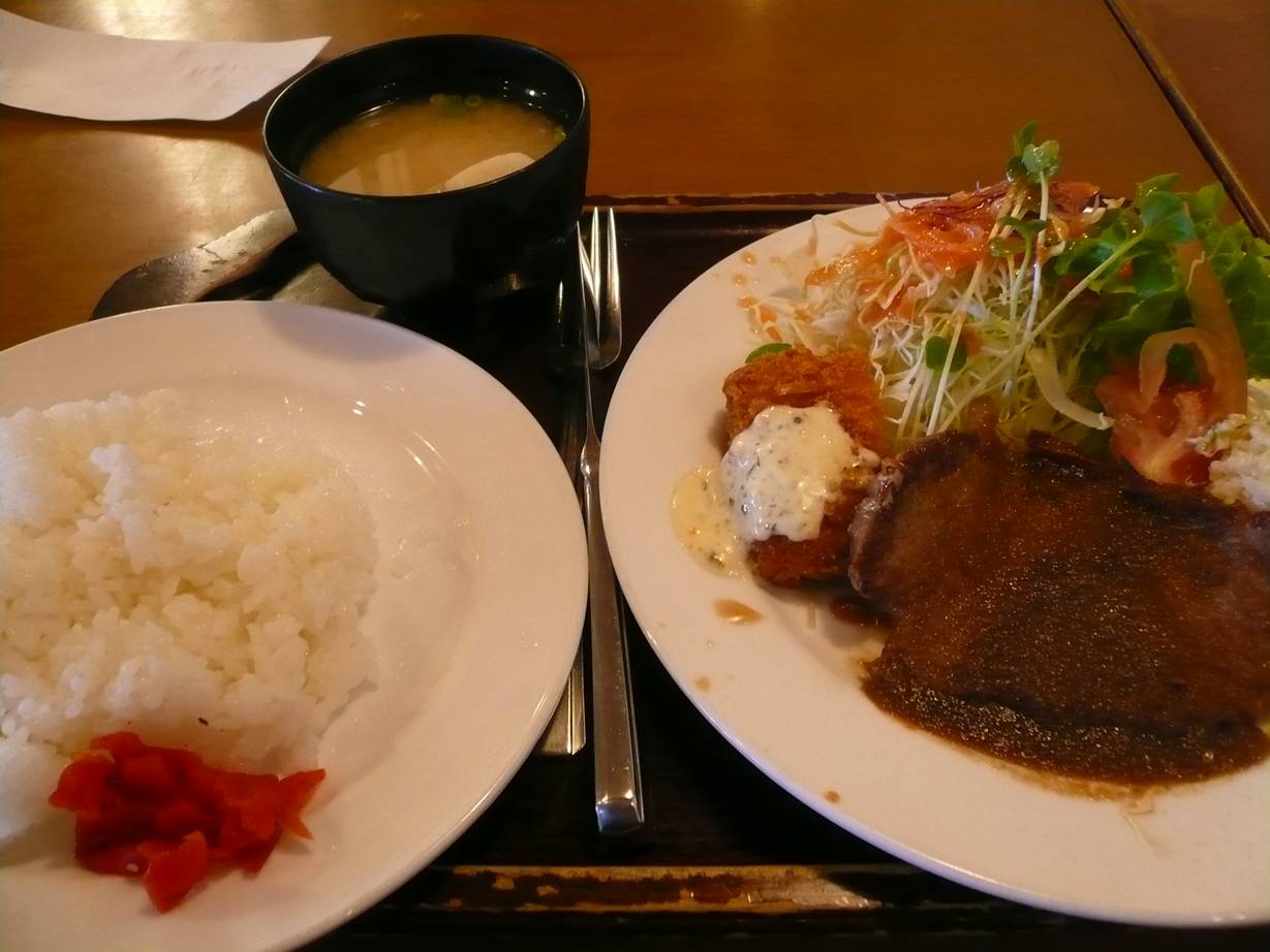広島市西区横川町1-13辺り ちょっと久々に寄ったこのお店へ。 雑誌がゆっくり読めたり、新聞がたくさんあったり楽にいられるお店です。 メニューは揚げものが多いのですが、定食はいつも無難に食べれる。 今日もランチを・・・・、って思ったら品切れだった。 代わりのメニューとして紹介してもらったものです。 ステーキランチ750円。 随分安いなぁ、って思ったらランチが切れた代わりに出したので安いらしい。 ステーキは薄く小さな感じ。 ステーキソースにニンニクが効いてて少し驚いたがまぁ食べやすい感じ。 ご飯が柔らかいけど普通に頼んだら結構量が出てくるので抑え目に。 サラダはドレッシングが甘くて酸っぱい。 面白いなぁ。 やはりここは定食かな? 単品もあるけど定食がお得だ。 ご馳走様でした。