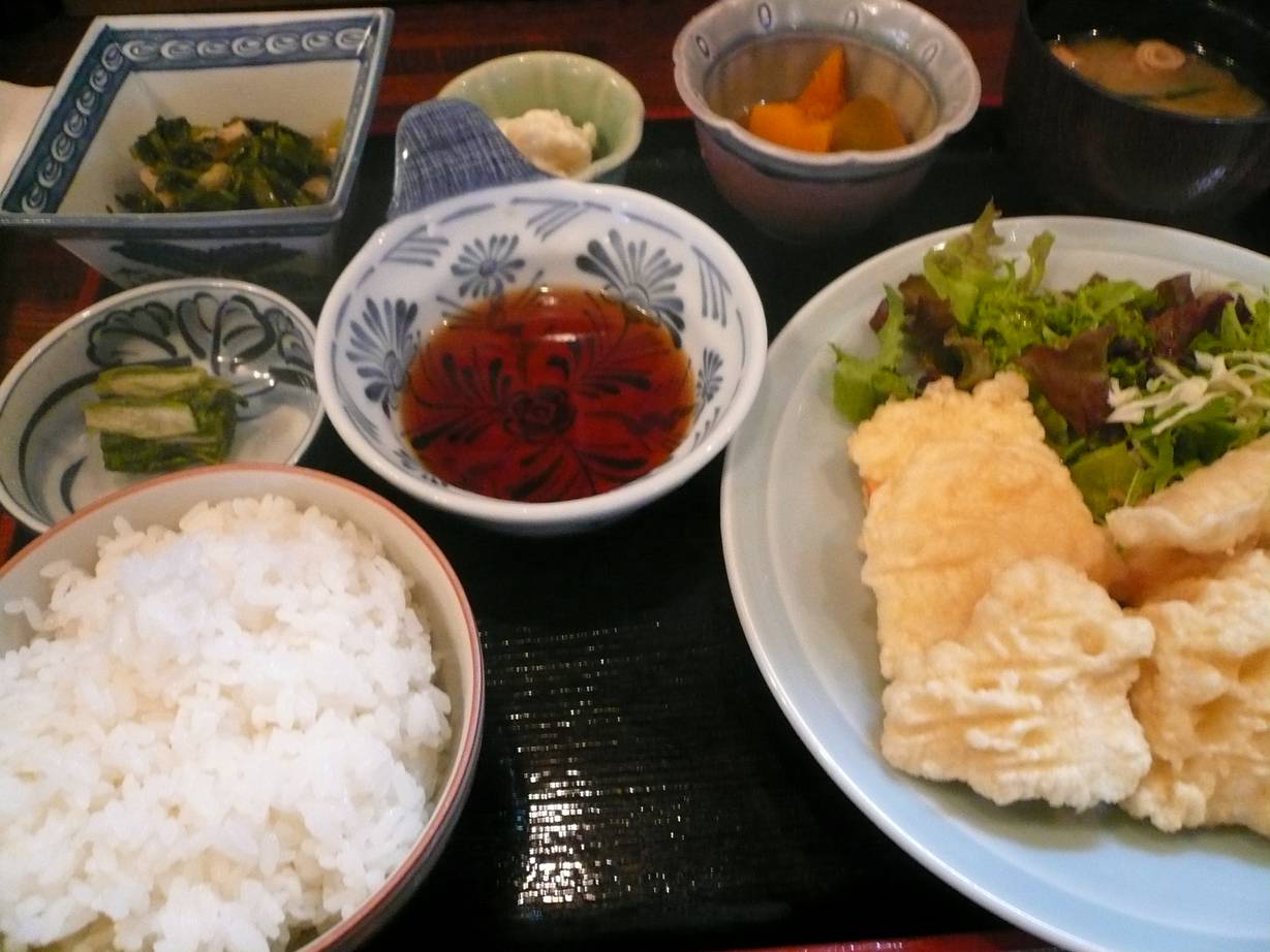 広島市安佐北区口田南7-12-27 082-845-0002 今日は少し遠出でランチ。 和食料理屋さんっぽいお店でランチは日替わりとどんぶりものが多い。 少し値段が高く感じたので値ごろ感がありそうな日替わりで。 少し待って出てきたぞ・・・。 日替わり定食800円。 てんぷらがメインのたくさん品数があるランチだ。 メインの天ぷらは白身の魚とさつまいも。 白身は鯛かな? 少しぱさっとするけどアツアツなので楽しいではないか。 じゃがいもはやっぱり天ぷらってうまいよね。 これが合計で6~7個ゴロゴロ入ってた。 凄いよね。 他にもおかずが多かったけど軽くさらっと煮てあった大根の葉(だと思う)の苦味が嬉しかったなぁ。 ご飯も旨かったし。 腹いっぱいになったし嬉しかったなぁ。 次は天丼を食べてみようかな? ご馳走様でした。