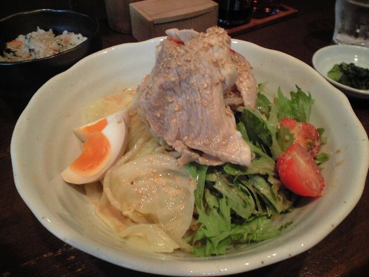 広島市安佐南区川内5-21-44 082-870-0638 今日は実に久々に来たこのお店。 以前は連チャンで来てたのですがちょっと場所の問題で行けなかった。 久々に行ったらお客さんも一杯。 すっかり人気店ですね。 メニューも季節限定品が多くて驚く。 よく思いつくんですねぇ、すげぇ! 豚しゃぶ冷し麺ゴマダレ風890円。 ゴマだれはピリ辛って書いてあったけど辛味はない。 ってよりマヨネーズに近い味が下味にあるのだろうか? って感じで食べれるベースのどこか甘いタレ。 甘みに強い自分としては面白い感じだが少し濃いめかな? ゴマだれってこういった感じだけどねぇ。 麺は平麺でいい歯ごたえ。 ただ何故かほぐれは悪い。 ちょっと表面に水分がなくなってたのかなぁ? 代わりに野菜のキャベツや水菜はすっきりしてて美味しかったです。 トマトはゴマだれによく合うしね♪ 卵も臭くなくて美味しい。 いやぁ、正直旨いんですが何故か、ほんとに何故か自分が辛口になる気がする。 何故だろう(笑)? 季節のメニューも増えて楽しいなぁ。 次はもう一つあった味噌つけ麺かな? それともまだ食べてない塩ラーメンかな? ご馳走様でした!