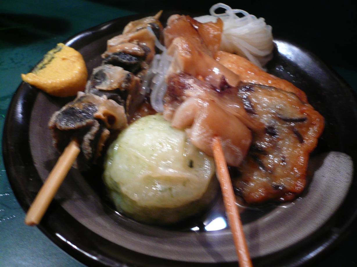 福岡市博多区中洲1丁目那珂川 モツ鍋を軽くつついたあと、待望の屋台へ。 たくさんある屋台の中、今回はラーメンが多い屋台群へ。 とても気になったお店も多いのですが、今回は一番端っこにあったのでチョイス。 とても若い人がやっていたお店で、周りのスタッフもすぐに置いているゴミを捨てたりして気持ちのいいお店でした。 串焼き(バラ・軟骨・トマト・砂肝) どれも特別な味ではないんですが・・・、いや、軟骨がしっかりしていて面白かった。 どれも少し焼きが強く硬めになってたが脂が軽くて食べやすかったし、最近よくあるトマトを巻いた焼き鳥もありがたい。 おでん。 鰹の香りの強い出汁で煮込んで香りで食べるタイプ。 練り物、肉系が多い。 自分はありがたいなぁ←練り物好き。 ここも決して安くはないのだが桜を見ながら周りの人と仲良くなりながら、ってのが調味料になってていい雰囲気。 この雰囲気もご馳走ですね。 ご馳走様でした。