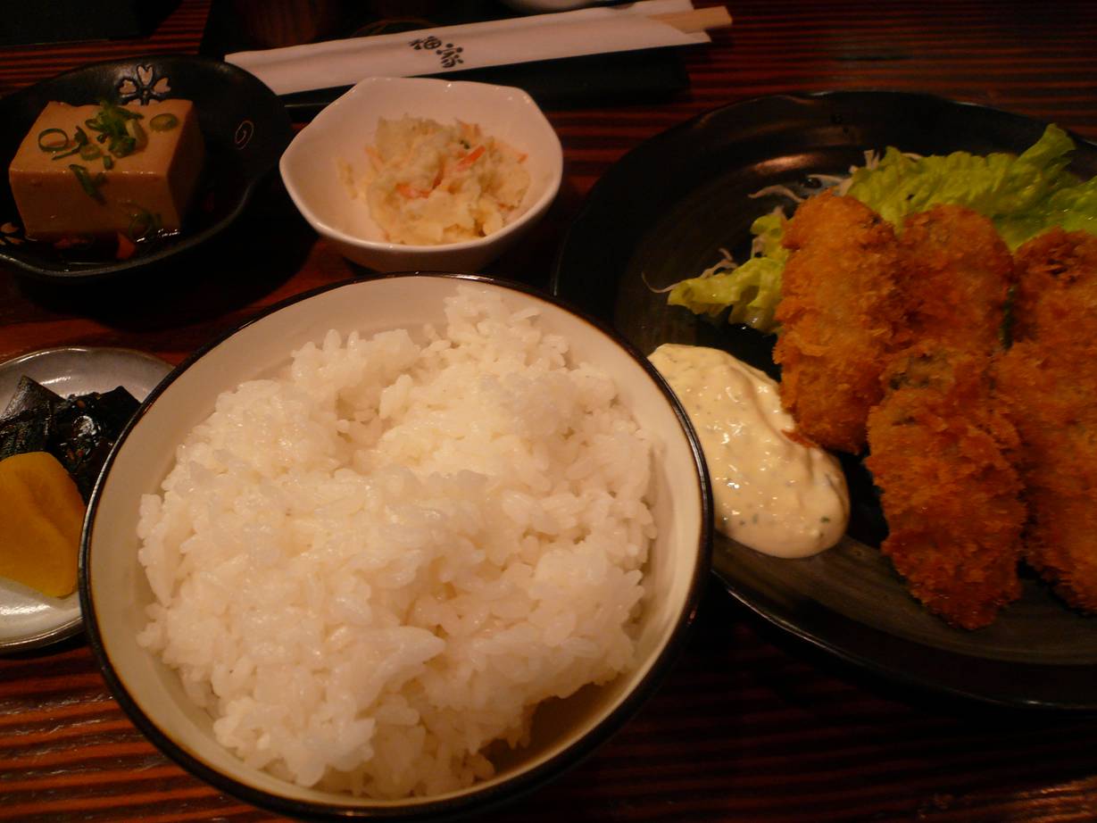 広島市西区三篠町1-7-14 082-237-2667 今日はランチを始められたこのお店。 以前からいつかはランチも始めますって聞いてましたが始められたみたい。 ランチは日替わりが500円台であったので迷ったがカキフライと言う名前には相変わらず負けてしまう。 ううむううむ。 カキフライ定食700円。 カキフライに煮豆腐、ポテトサラダ、おみおつけ系、そして写真はないがお吸い物(うどんと選べる)、そして大盛りのごはん。 カキフライは衣がサクッとして旨い。 カキフライの香りもしっかりあるし何より揚げたてってのが嬉しい。 ちなみに5粒は意外とありがたい量だ。 お吸い物が熱々だったのと(アサリが入ってた)ポテトサラダの甘さが少し驚いたがなかなか旨いし、ランチらしいランチだなぁ。 ご飯もたっぷりだしいいランチだと思う。 次は日替りで食べてみたいなぁ。 ってよりこのお店、たぶん顔ばれしてますなぁ。 どうも最近顔ばれ店が多くなったなぁ(苦笑)。 ご馳走様でした!!