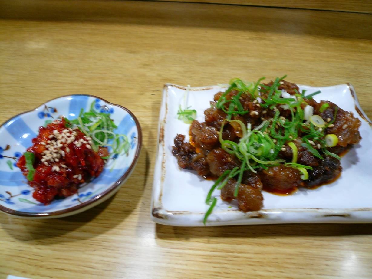 大阪市北区角田町新梅田食堂街1F 今日は友達と吞み会。 ってことで梅田で待ち合わせなんですが暇なのでちょっと新梅田食堂街へ。 ちょっとウロウロすると色んなお店があって嬉しいなぁ♪ 今年の一食目はここに決定!! チャンジャ・韓国風スジ煮込み。 チャンジャは瓶から出されてゴマを上からかけてた。 市販のものかな? ちょっとくにくにして気持ちいい歯ごたえ。 チャンジャって歯ごたえが命。 モツらしいくにくに感が旨い。 辛さはほどほど。 酒がすすむなぁ♪ 韓国風スジ煮込みは、スジのゼラチンがぐにゃっとして独特。 韓国風ってのは辛味のことだろうか? ラー油みたいな風味の辛さで面白い。 これはビールですなぁ♪ これでビール1杯で1,890円だから少し高い気がするが楽に行けるし立地的にはこれくらいなんだろうなぁ。 ここは楽しい店だ。 また行きたいなぁ。 ご馳走様でした。 あと、本年もよろしくね!