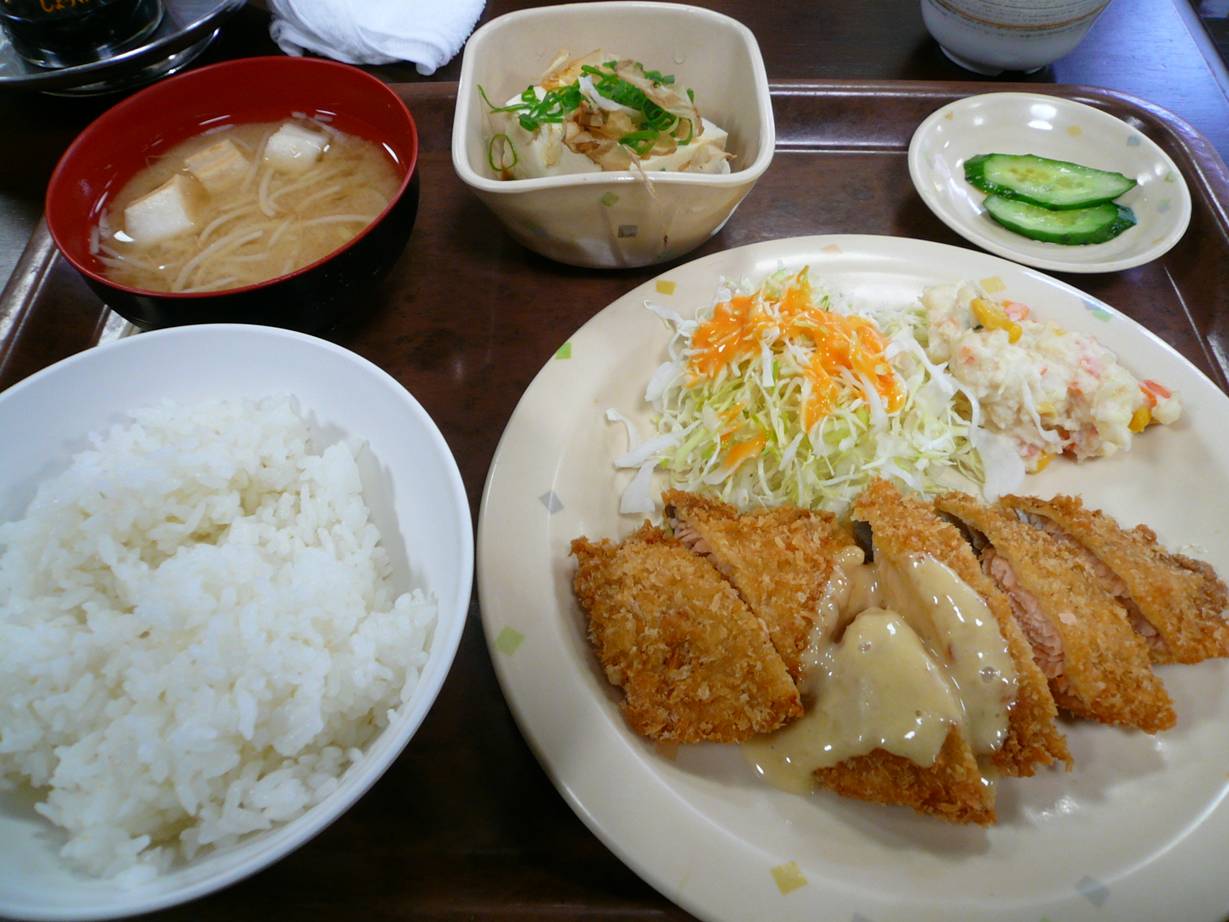 広島市中区東白島町19-16 今日は人間ドック。 ってことでセットになってる定食をいただきました。 ランチとして食べる感じではないのだが、せっかくなので報告。 これを見て広島に期待とは思わないかな? 病院食で(苦笑)。 定食(人間ドックにセット)。 今日は鮭のフライ定食。 フライを病院食で出していいのだろうかと不純なことを思いながら食べる。 揚げたてだから鮭の香りがぷーんとっして嬉しいねぇ。 ちょっとぱさついてるけどこの香りで御飯が食べれる。 無論塩分は控えめ。 冷ややっこと思ったら暖かい豆腐、味噌汁、柔らかいご飯ってやはり病院食だなぁ、って痛感。 これで身体がよくなるかはわからないが、やはり安心ですね。 あまり病院には行きたくないので次は!ってのは思いつきません(笑)。 でもありがとうございました。 ご馳走様でした。