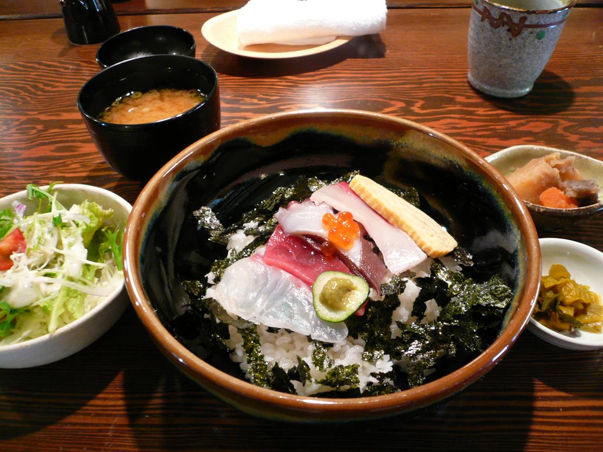 広島市中区幟町7-7-1 082-227-5825 今日は街中の居酒屋さんでランチタイム。 とても小ぎれいで若い人が頑張ってるんだろうなぁ、って感じられる店。 こういったこじゃれた店もたまにはいいなぁ。 まぁそれにためらう年でもないし・・・(苦笑)。 海鮮丼700円。 正直出てきたときの感想は・・・。 「これだけぇ~?」 って思った。 だってご飯の上に5切れはちょっと辛い。 色んなサブメニューがあるのだが、メインはインパクトがねぇ。 ご飯は酢飯でなく、普通のごはんで暖かめ。 刺身は、マグロがかなり旨い。 あれっ、こういった店の刺身ってあまり当たりがないのだけど、意外とまぐろの独特の甘さと香りがあって、結構好きかも♪ 他のネタもインパクトは薄いが、意外と旨い。 ただ、やはりご飯は余るよね(涙)。 おかずがいろいろあるので一気にがっつりいただいた。 旨いだけに、どうもどうも・・・。 でも、自分の感想は旨い店だと思った。 少なくとも夜にも一度行ってみたいかも。 スタッフの若さとは関係なく旨い店は旨いものが食えるものだ。 美味しかった。 ご馳走様でした!
