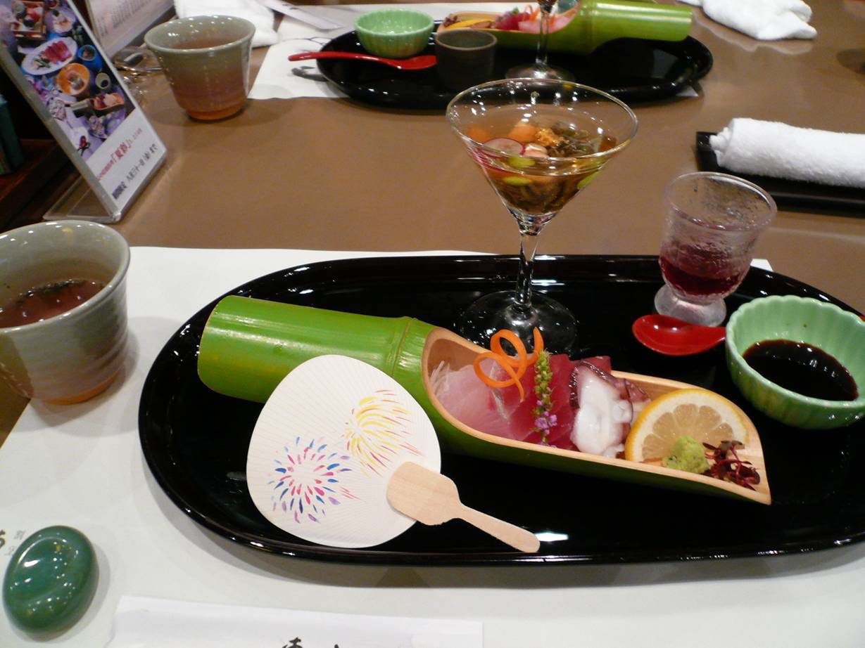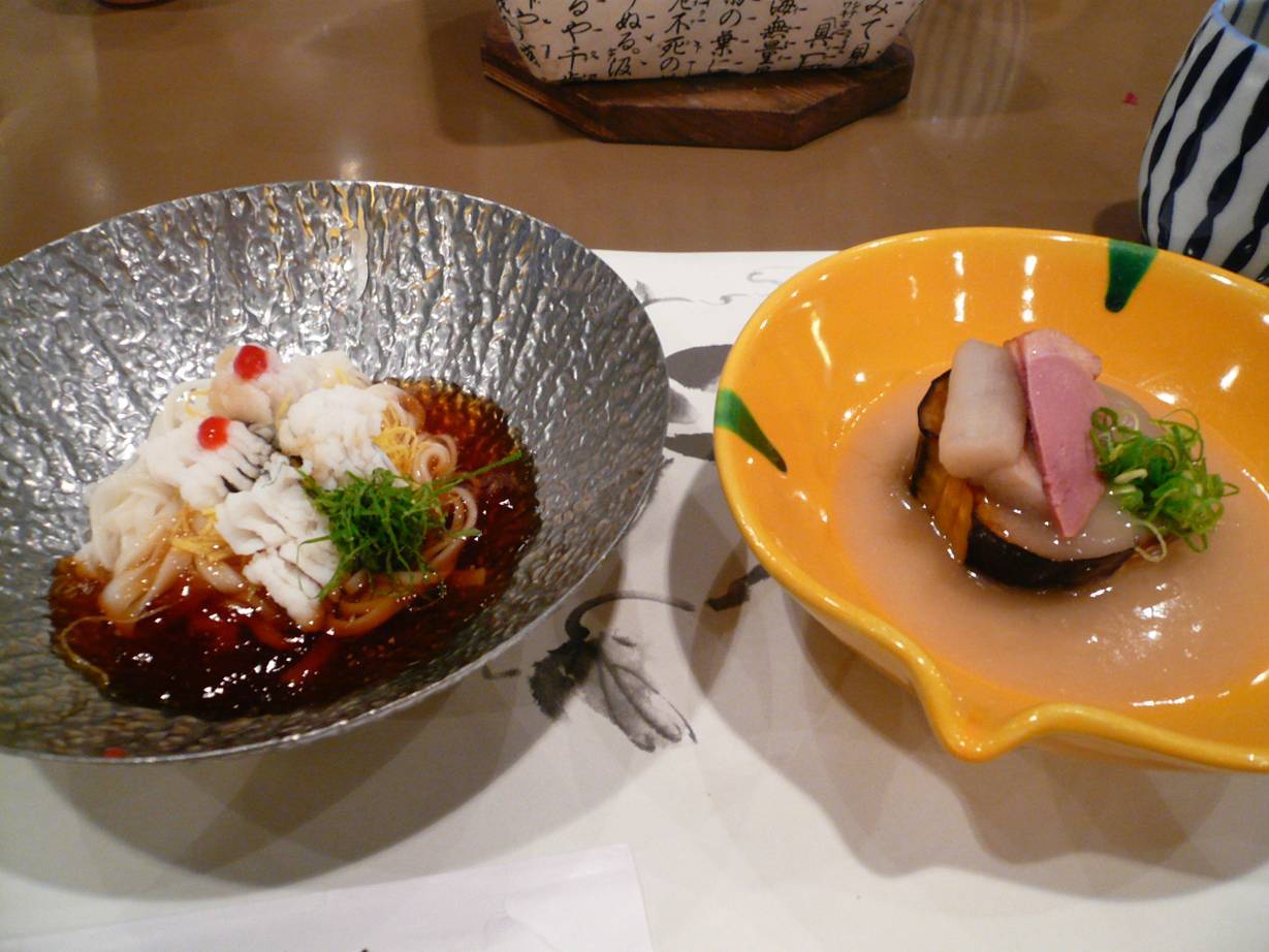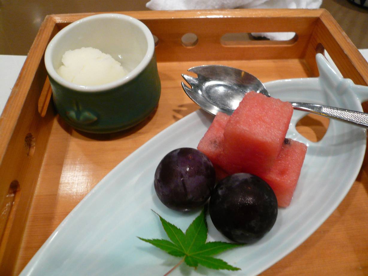 奈良市三条大路一丁目594番地 0742-35-0555 今日は親孝行しようと(4年に1回くらい思う)、ちょっと奈良では有名な和食の代表店へ。 自分からはなかなかいこうと思わないのだが、せっかくなので行ってみました。 多分10年以上ぶりではないだろうか・・・? 夏彩コース5,250円。 どの料理もきれいだし、旨いのだけど、どうも特別なものは無い期がするなぁ・・・。 食材もいいのだろうし、特別何も手を加えず、さらっとしてるのだけど意外と面白さも見つからない。 きっと面白さを求めたら駄目なんだろうけど、食べてうきうきするものが以前はあったのだけど、今回はなるほど!って気持ちもあまりわかなかった。 難しいものだ・・・。 あとサービル料をとる割にはサービスはひどいぞ! こぼして無視とか、贖罪聞いても「わからない」のまま確認しないのは無しだろう・・・。 奈良の有名店。 次に行くことがあれば期待します! ご馳走様でした。 前菜。 カンパチ・まぐろ・タコの刺身。 ジュンサイ・食前酒のぶどうジュースの酢割り。 夏らしいの食べ物だねぇ。 紫蘇でできたお茶も爽やかだ。 肉を炭で焼く。 肉はずいぶん柔らかい。 少し内蔵の匂いがあるが旨い。 稲庭うどん・米ナスのあんかけ。 稲庭うどんはハモが、米ナスは鴨が乗っている。 贅沢だねぇ♪ 鮎の一夜干し。 鮎を一夜干しして食べるのは初めてだ。 でもあまり鮎の香りはしないなぁ・・・。 お茶漬け。 出汁で食べるタイプではなくお茶で食う。 明太子の茶づけは旨いなぁ。 デザート。 フルーツは季節だね。 あとはシークワーサーのシャーベット。 酸味が最期を締めるねぇ。