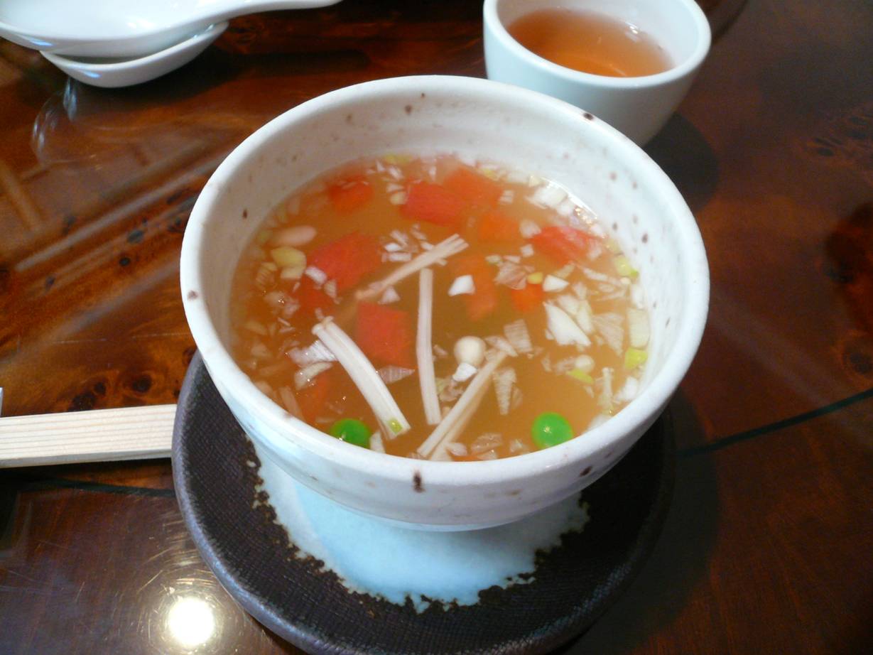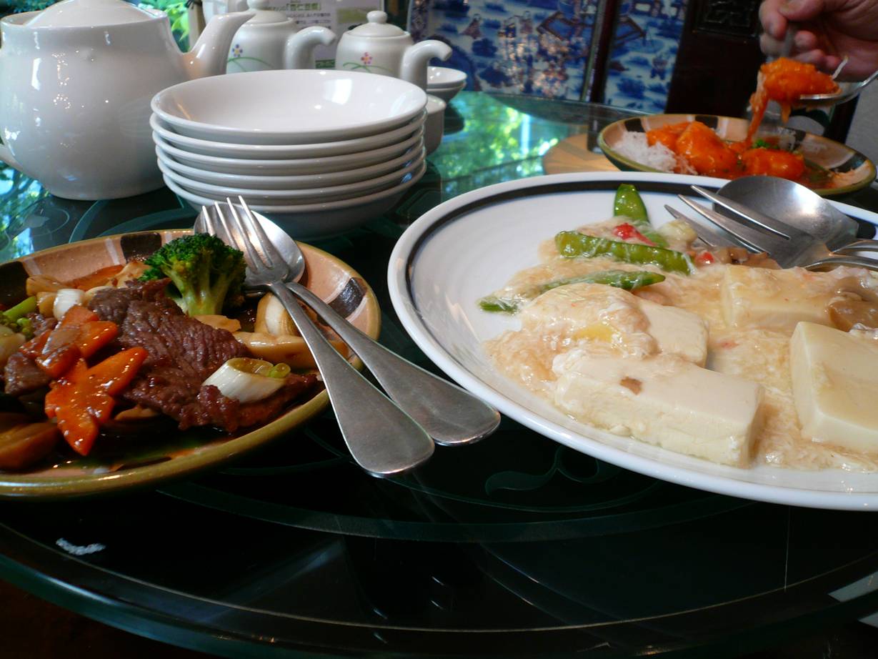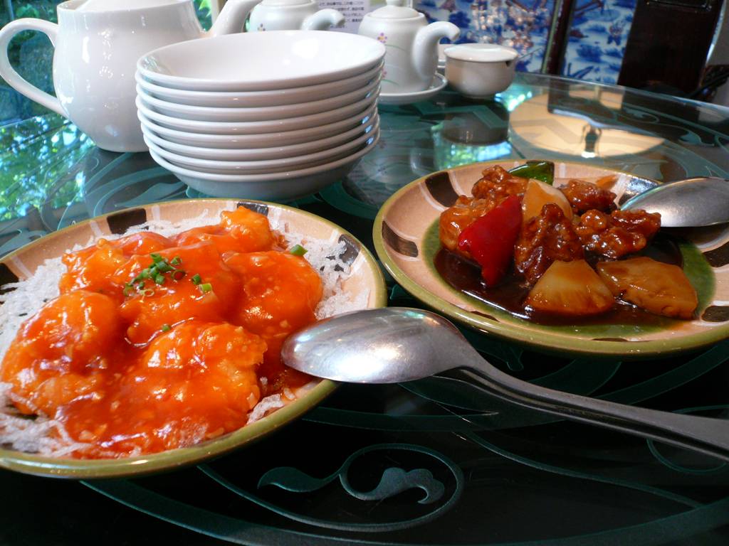 奈良市法華寺町254 0742-34-1136 今日は親と奈良ロイヤルホテルの中華屋さん。 ただ、ホテルの中にあるのではなく、ホテルの敷居内の離れにあるお店。 雰囲気は和食の会席のお店。 でも中華ってのは面白いかも♪ アラカルトセット2,000円。 まずはスープ。 野菜たっぷり。 中華料理屋さんのスープですがあまり後味が悪くなく少し濃いめに味付けされている。 スタートから結構がっつんくる味かもしれない。 こういったホテル食としては珍しいかな。 海老チリ・酢豚。 ちなみにアラカルトはいろんな種類から2品をチョイス。 こちらは海老チリと酢豚。 いやぁ、大きな海老がごろっとしてますなぁ。 チリソースはそんなに甘くなく旨い。 結構こちらも濃い目かな? あまりごちゃごちゃとして具材が入ってないのが面白い。 酢豚も同様、あまりごちゃごちゃと食材は入ってない。 3色パプリカにパイナップルに豚。 豚がごっつい感じで、でも意外と柔らかい。 触感はごつっとしてるんだけど、繊維は気にならない柔らかさ。 酸味は酢の酸味にパイナップルの酸味が加わって、ちょっと酸味は強いか。 でもごはんと一緒に食べれると考えたら意外と食える。 全体的に濃い目だがご飯に合わせてるのかな? 親が頼んだ豆腐と蟹の煮込み・牛と野菜のオイスターソース炒め。 豆腐は蟹の香りがしみ込んでる。 でも蟹の味は抜けてない。 はんなりした蟹の味がよく合ってるが、少し気になる苦味がある。 何だろう?ちょっと気になる。 えぐい。 牛はちょっと炒め過ぎな感もあるがオイスターソースで炒めたら結構濃い味をイメージしたらそこまでではなかった。 意外意外の連発かな? 味は甘みが少なくて面白い。 飲茶のような饅頭。 どうも、皮が蓬莱を思い出す食感(笑)。 具は魚介なのか、もちっとしてる。 少しのどに詰まる感が面白いかも。 これにココナッツデザート(ミルクにタピオカ)がついてくる。 雰囲気もご馳走だが、周りに歩く女性が気が効いてるし、いい気分で食べれた。 お変わりも水も、おしぼりもこちらをどこで見てるのか不思議なくらいだった。 また知り合いと行きたいお店だなぁ。 ご馳走様でした!