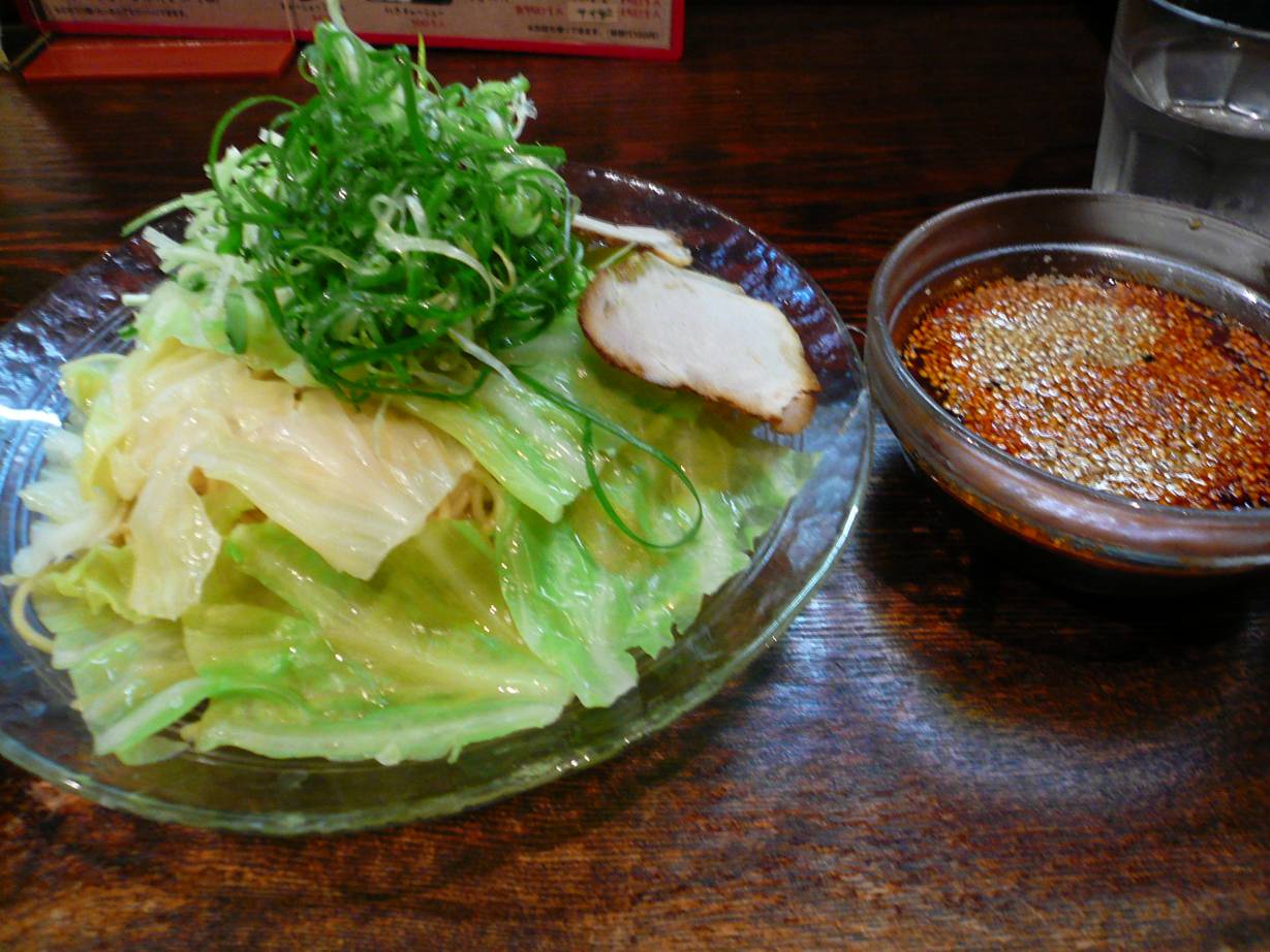 広島市中区十日市町1-4-29 082-294-2225 今日は、ってより最近かなり疲れがたまって食欲がない。 いつもは食欲だけは落ちなかったのだけど、歳だろうか? 疲れだろうか? どうも食べるのが辛い。 だから昨日は昼をカットしたのだけど、逆に後々辛かったから今日は食べるぞ! やはりこんな時は冷やし麺だね。 つけ麺650円。 やはりキャベツたっぷりで食べれるのはありがたい。 そんなに高くないし。 辛さは選べるけど3辛で(最大50くらいまであったかな?)。 汁は少しだけ酸味があるかな? 辛さは正直弱かった。 ただ疲れてる時にはこんなくらいの刺激がちょうどいい。 麺は少し太めかな? ごしごしした歯ごたえがあり、よく冷えてて旨い。 チャーシューはそんなにインパクトはないけど汁につけて食べやすい、脂分の少ない感じかな? 今の状況にはかなりありがたい飯となったなぁ。 隣の人がキャベツの代わりにノリと鰹節のたっぷりかかったつけ麺(600円だったかな?)を食べてたけど香りがとてもよかったので見てて旨そうだった。 ただキャベツが無くなるのはなぁ・・・。 でも食べてみたい! ご馳走様でした!