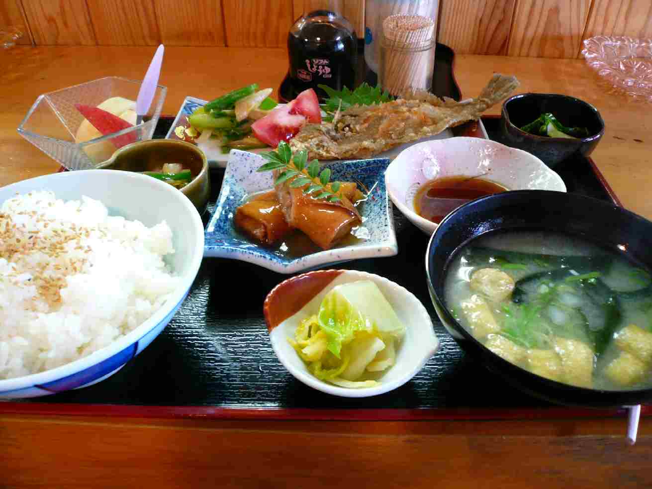 広島市西区中広町3-1 今日ははじめていく不思議な居酒屋さん。 奥さんがちょっとお化粧をしている雰囲気がお水みたいな感じ。 でも店はもろに居酒屋。 なんかアンバランス(笑)。 ランチ680円。 ランチはカレイの唐揚。 カレイはからっと揚がってるのだけど非常に残ってる油が臭い。 あれれっ、って感じ。 さすがに昼終わりに行ったからかなぁ?ちょっとタイミングが悪かったか。 カレイ自身に味はついてないし、油の強さばかりが気になったなぁ・・・。 餡かけ春巻き(あんだろうか?)は冷えてたし、パリパリ感は全く無いのだけどこれが意外とご飯に合う。 濃い味付けだからだろうか?これ一本でご飯ががつがつ食べれそう。 最後のリンゴが泣かせるねぇ(笑)。 ごちそうさまでした。