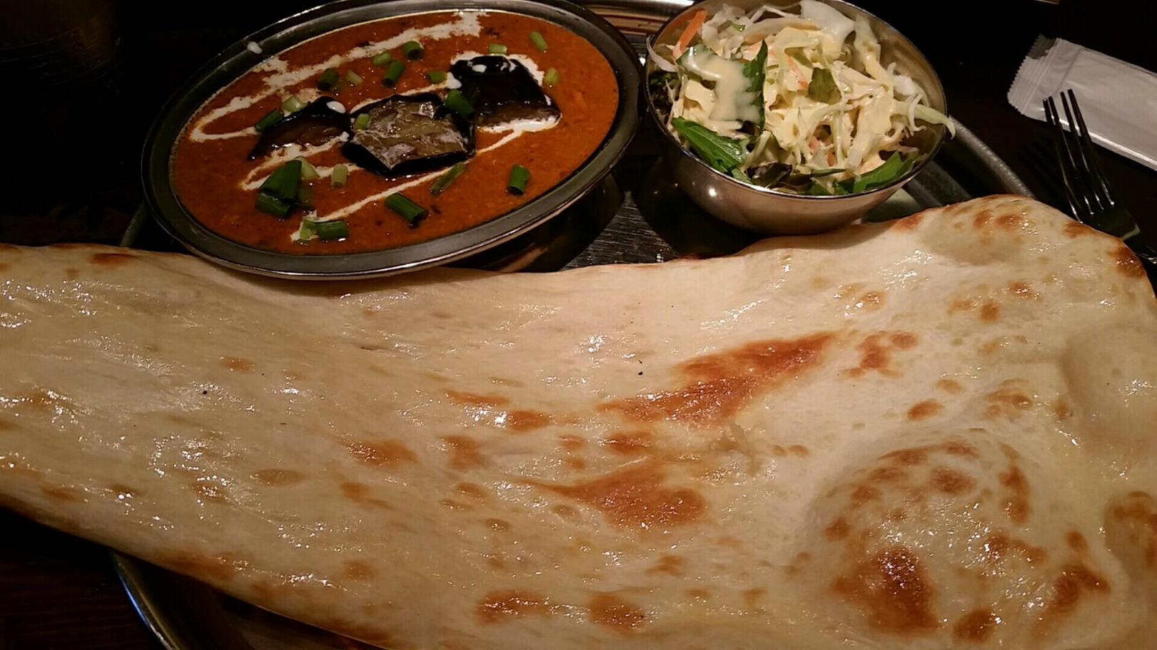 福岡市博多区店屋町1-14 092-272-1760 今日は偶然見つけたインド料理店へ。 まだまだこの辺りは開拓しないとな。 行っているつもりだけど、まだまだ知らないお店が多いんですよね。 こちらもそうでした。 ネパールとインドの料理が出されているようで、ランチはカレーがメインらしい。 さて今回はまず日替わりからチョイスしました。 日替わり790円。 この日はナスとキーマのカレー。 そして大きななんとサラダがついてくる。 穏やかなカレーでとろみもしっかりしていている。 ナスがとろとろで甘く、カレー自身もそんなに辛くない。 なによりナンが大きくてバターの香りがしっかりしていて面白いなぁ。 ナンについたバターが気になることが多いけど、ここまではっきりとバターを使われると逆に面白かった。 面白いお店ですね。 次はネパールカレーも食べてみたいな。 ご馳走様でした。