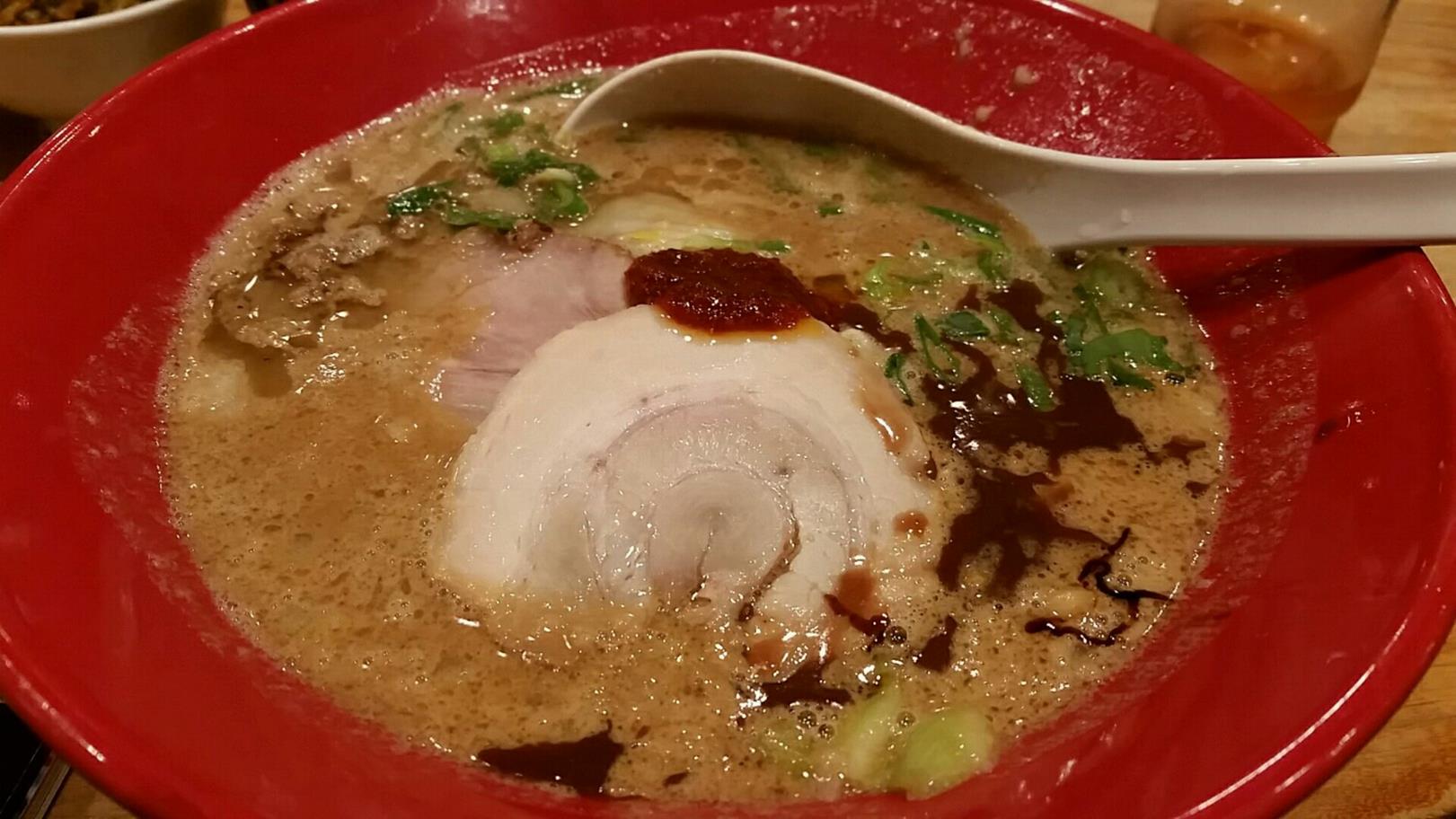 福岡市西区福重5-4-14 092-895-1155 寒い寒い夜。 くたびれきって家に帰る夜。 そんな時に明るいお店にひきつけられてしまう時ってありますよね。 深夜0時を超えて入ったこちらのお店へ。 そんなに重いものを食べるつもりはなかったんですが。 なんとなく寒いし、いいかなって感じです。 疲れもあったしね。 さてメニューを見たら季節限定のものがありました。 さっそくそちらをチョイス。 味噌赤丸860円。 味噌の香りがよく美味そうですね。 スープは一風堂そのままの豚骨スープですかね。 ずっしりしたものには背脂も強化されている。 そして強めの味噌味。 味噌汁にはならずしっかりラーメンスープになっている。 麺は太めのぷよぷよしたもので、この味噌と絡んで美味いですね。 脂が強くて冷めないのもうれしい。 でも、この時間にはかなりこたえました(苦笑)。 そしてマー油もそこまでいらないかな? ニンニクの香りは良かったけどね。 でも美味しいラーメンでした。 さすがは一風堂って感じでした。 また次は餃子とかもしっかり食べてみたいな。 ご馳走様でした!
