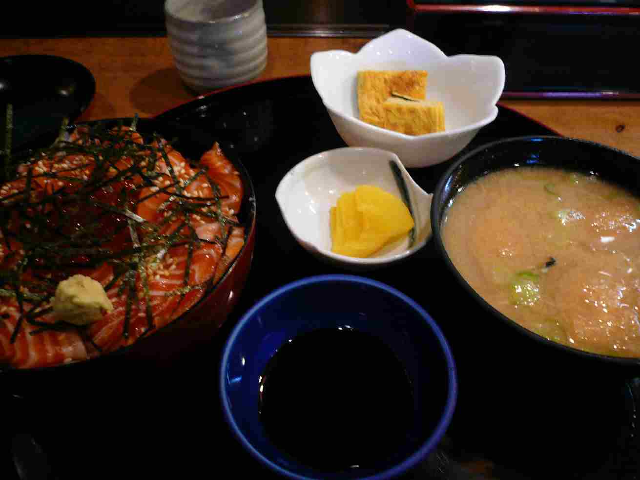広島市西区大芝3-15-21 082-239-3448 今日は無性に魚を食べたくなり、このお店へ。西区と安佐南区の境目にあるかなりわかりにくい感じのところにあるお店。 以前一度夜に行って焼き魚をばりばりいただいてお酒を呑んだ記憶があり行きました。 黒板には、海鮮丼と刺身定食と日替りが。 いつもなら日替りなのだが、その日に限ってトリの塩焼きって書いてあったのでパス。 もしかしたら「トリ」という魚介類があるのでは!?なんて後で思ったけどね(笑)。 海鮮丼700円。 海鮮丼はサーモンとイクラ。サーモンがたっぷりのってあり、その上からいくらが軽く。それに卵焼きと味噌汁。 たっぷりのサーモンはこってりしてて、ワサビをたっぷりつけると嬉しいものです。 ・・・しかしたっぷりすぎて後半がきつかった!ワサビも使い果たし濃厚なサーモンにイクラが加わるとちょっと重かったのも現実。昔はよく食べれたのになぁ・・・。歳か!? 卵焼きにはのりを巻いてあり、まぁ普通に旨い感じかな? あっ、海鮮丼にものりがサーモンの下にも上にも乗ってたか。でも下の大きなのりは切れないので食べにくかったなぁ。 味噌汁はビックリするほど濃く、ネギと油揚げの味噌汁。 でもかすかに魚の味がするので何かアラででも出汁をとったのかな?身は入ってなかったけどね。 濃厚でたっぷり食べれるので嬉しいのですが、次はやっぱり焼き魚系か刺身定食を食べようかな? ご馳走様でした!