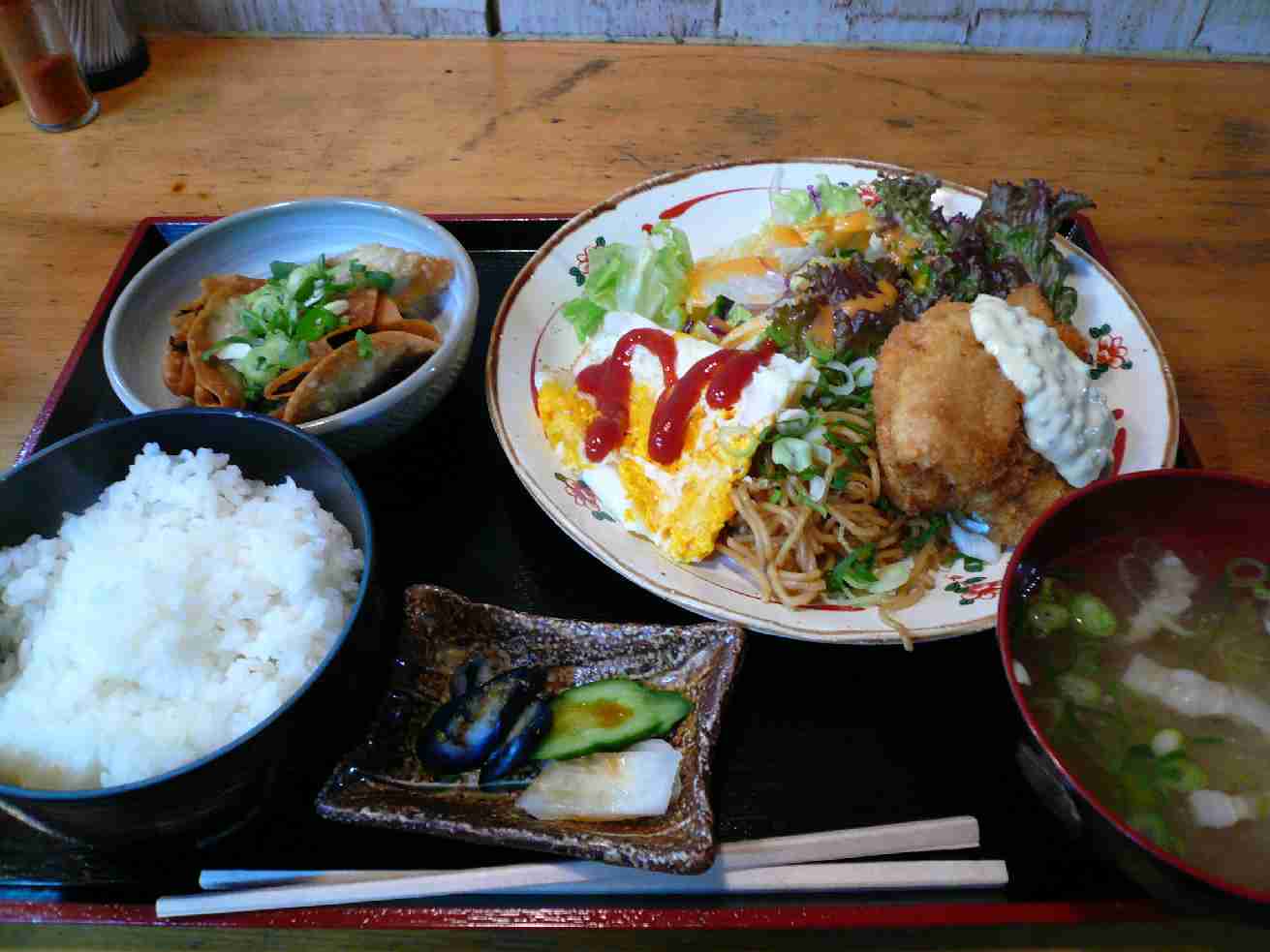 広島市中区袋町1-30 082-249-1606 今日は街中のど真ん中でランチを。 入ってみると随分と荷物がごみごみしていてちょっとやな感じ。 入る前から外した? って気になってしまったなぁ。 昼定食650円。 メインはタルタルソースがたっぷりかかった魚フライ。 食べてみたら手作りっぽいなぁ。 意外な感じ。あのジャンクっぽいバリバリしたタイプではなく 変な感じがしました(笑)。 あと卵焼きはわざとか、あまりかき混ぜてないタイプ。 理由が良くわからない味でした。 餃子や柔らかいご飯もあって面白かったけど 味噌汁がちょっと柚子胡椒風味で面白かった。 夜は居酒屋さんになる感じで 張り紙に豚のモツ関係が書いてあったなぁ。 もうちっと綺麗に落ち着いてくれたら行きやすくなるのに・・・。 若い人で頑張ってるのだからなぁ。 ご馳走様でした。
