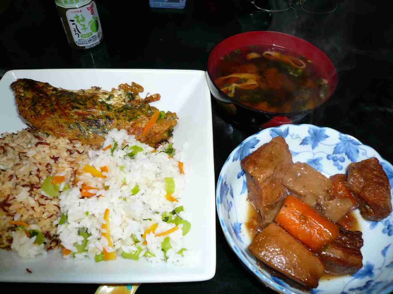 今日は家から5分で行ける「三次きん菜館」で野菜を買う。 農家が出し合ってる市場で野菜で旨いし、安い。 写真の聖護院大根と人参がこれだけで180円。 掘りたてでこの値段だとスーパーに行ってられない。 そこで何を作ろうかと考えてると豚バラが100g82円で売っているではないか!? これは安い! だから600g買う。 そこで『ネコ吉』さんが作ってた豚バラのコーラ煮を自分なりにアレンジして作ってみる。 ①豚バラをブロックのまま焦げ目がつくまで焼く(油はひかない) ②豚バラを塩で軽く茹でる(脂抜き) ③コーラ500gに塩を一つまみ、ニュクマムを40g加えて 火をかけ大きめに切った豚を投入。 ④そこにニンニク・生姜を加える ⑤豚を1時間くらい煮込んだら、大根と人参を加えてさらに 1時間煮込む。 ⑥甘味が苦手だから柚子胡椒を最後に加える。 出来上がり。 しかし、大根と人参が余る・・・。 そこで野菜ご飯を炊く ①大根・人参を酢水につけておく。 ②大根葉を塩茹でして水で締めて水切りをする。 ③ご飯に出汁、人参、大根を入れて炊く。 ④炊き上がったら大根葉を加える。 出来上がり♪ しかししかし、大根の皮と人参の皮と大根葉が余る。 もったいないお化けが隣から出てきてそうだからこれも食べる。 ①人参葉を塩茹でして水で冷やしてザグ切り。 ②ごま油で人参葉、大根の皮、人参の皮を炒める。 ③味醂と醤油で味付けする。 これでご飯がガツガツ食えるが今回はオムレツの具にする。 できあがり! 肉がほんとにトロトロになって甘味も意外と強くなく(ダイエットペプシだからかな?)旨いなぁ♪ しかもこれで1,000円かからない。 3日分くらいだから一日300円くらいかな? ってより自炊自身が楽しい気持ちになれますなぁ♪ それに食材って捨てるものは無いものですなぁ。 自然に優しくなれました。 ご馳走様でした!