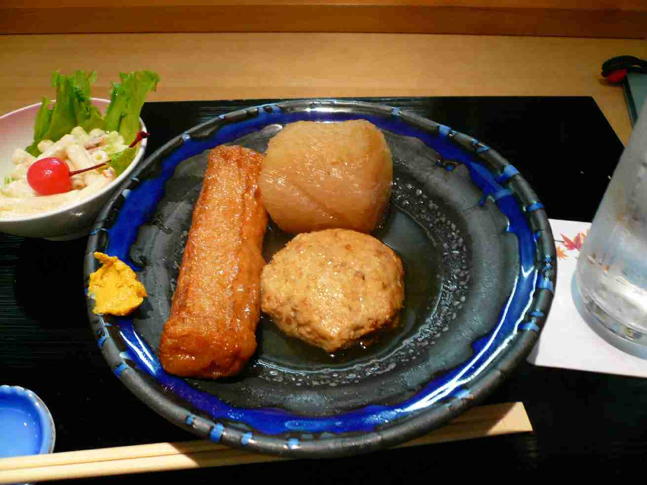広島市中区胡町3-27 082-249-9334 今日は来週結婚する人の2次会の打ち合わせ。 寒い時期なのでおでんで。 知らないお店なのでかなり楽しみ♪ そしてたぶんご馳走してもらえる、って心が少しあり・・・(笑) 大根・ホタテ団子・ごぼう天。 焼酎と共に食べてみると・・・。 あれ、かなり甘い。 出汁を飲むとみりんの甘さかな?砂糖の甘さかな? かなり甘味が強調。 あっさりしたすき焼きの割り下みたい。 でもどの具もよく煮えてて味は染みてて旨いけど これは好みかなぁ? ちょっと自分は苦手。 ちなみにつきだしはマカロニサラダ。 さくらんぼが泣かせるねぇ(苦笑)。 あと、おでん4品と焼酎とつきだしで一人頭2,200円って 高くない? ご馳走様でした。