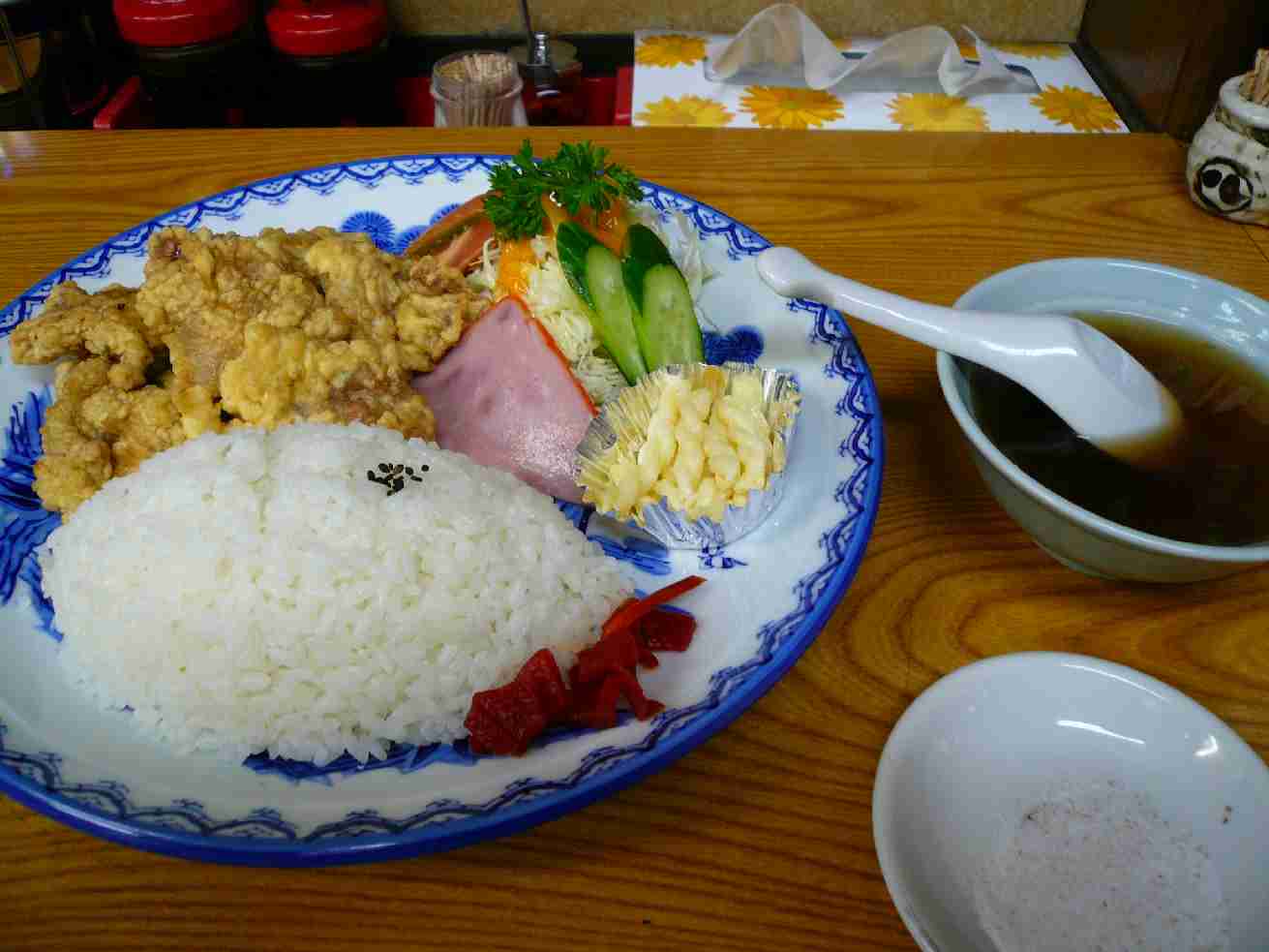 広島市安佐南区祇園2-1-31 082-871-3565 夕飯だけでもいいものを、って思ったのですが 予定したところがフラれて偶然見つけたこのお店へ。 街の定食屋さん(中華屋さん?)ってお店。 肉店定食。750円。 このご飯の盛り方がなんか学食を思い出しません? 懐かしくなってきました。 肉天は豚肉。けっこう分厚いやつです。 でも・・・、噛み切れない(苦笑)。 こんな感じがまた庶民的でいいかな? スープは強烈な調味料味。 ちょっと苦手かな? 庶民的なジャンク感は嫌いじゃないけど ここまできたらねぇ。 店は広島の2軍選手のサインでいっぱい。 きっと広島では愛されてるんだろうなぁ。 あっ、アンガールズのサインもあったな(笑)。 ご馳走様でした。