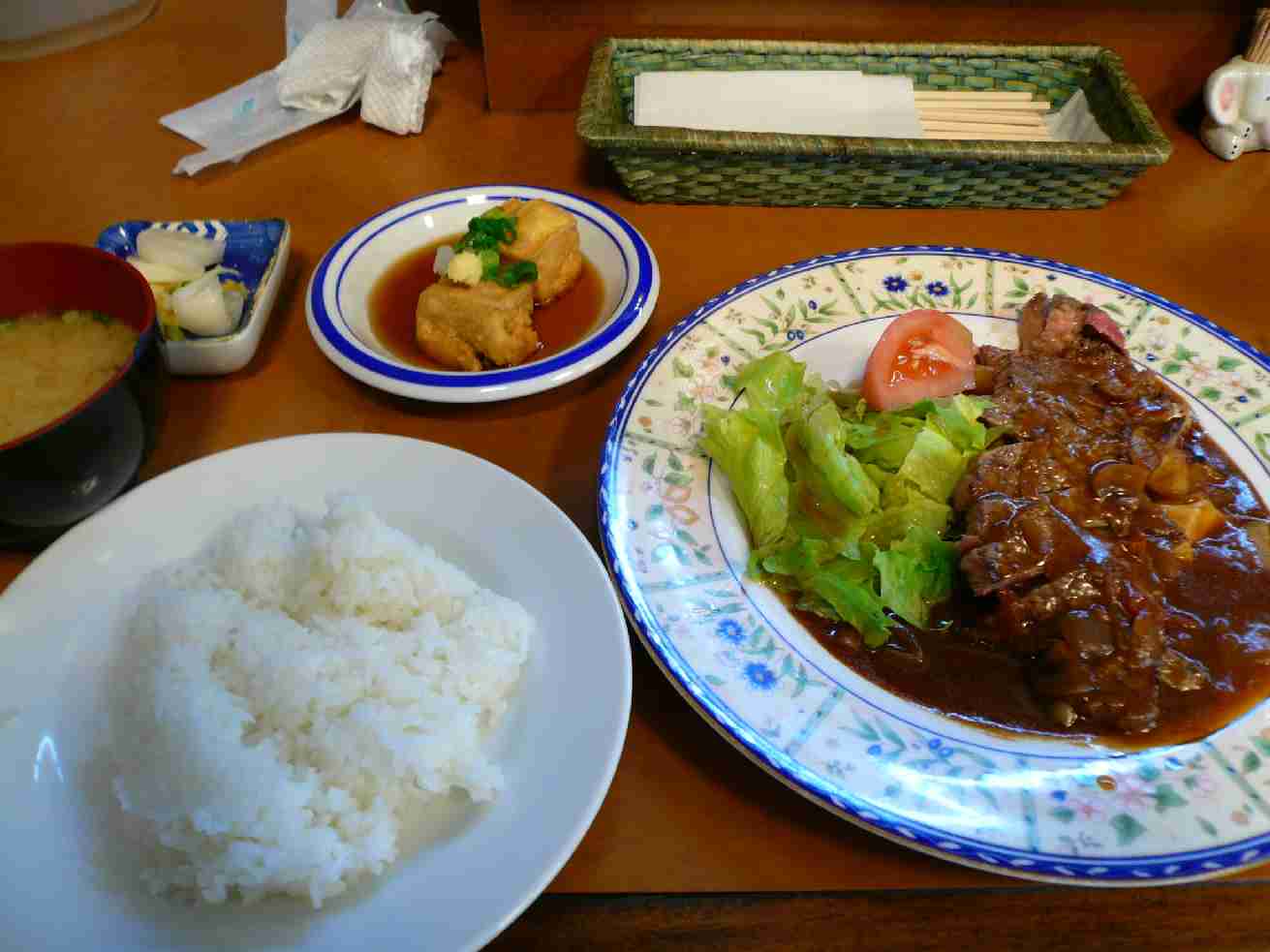広島市西区楠木町1丁目8-3-1 082-232-0222 このお店は自分の大好きなお店。 何せ「外さない」って料理が出てくるし、安いし、たまんないねぇ♪ だから夜ご飯のときに書こうと取っておいたのですが、 どうしても我慢できずに行ってしまいました。 今日のランチはなんだろう♪ 日替り。735円。 ランチで、しかも日替りで、それもこの値段でステーキが出ました!なんで!? しかもこれがまた旨いし、ボリューム満点! 肉もちょっと筋はあるけど硬くなく、噛むと脂の美味しさも十分! レアに焼いてるところにここの美味しいデミグラスソースが かかって旨いんだよなぁ♪ このソース。あっさりしてるけど美味しい! このソースをご飯にかけて食べるとこれまた最高! あと、味噌汁も小皿も(今日は厚揚げ)旨い! そして・・・、ここは漬物が旨い!! ちょっと酸味があって口の中さっぱり。 そしてまたがつがつ食べたくなる。 でもボリュームもたっぷりあるから満足できます。 夜も洋食が安くたっぷり出てきます。 多分1000円のランチでもここは行くし もっと高いディナーでも行くだろうなぁ。 商売下手だなぁ(笑)。 ご主人さんも奥さんも明らかに口下手な方ですけど 人間性は凄くあふれてますよ。 いいお店! 今日はとても満足しました! ご馳走様でした♪